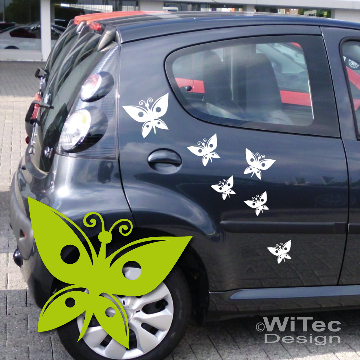 Boah, diese Auto-Aufkleber machen dein Auto zum Hingucker! Schmetterling und Blumen-Design - total feminin und stylisch. Jeder Aufkleber ist ca. 25x25 cm groß - also schön auffällig.\n\nAus hochwertigem PVC-Vinyl - wasserdicht, verblasst nicht und blättert nicht ab. Der Kleber hält bombenfest, auch in der Waschstraße! \n\nEinfach anzubringen: Auto sauber machen, Aufkleber anfeuchten und positionieren. Mit ner Karte die Luftblasen rausschieben - fertig! Tipp: Zu zweit geht's am besten.\n\nSchützt übrigens auch deinen Lack vor kleinen Kratzern. Und wenn du ihn mal nicht mehr willst: Lässt sich rückstandslos entfernen.\n\nMach dein Auto einzigartig und zeig deinen Style - mit diesen coolen Aufklebern!