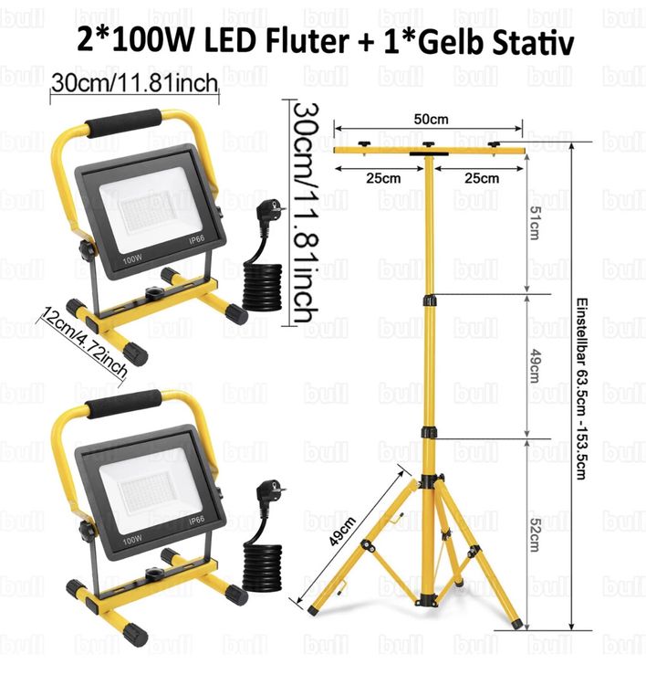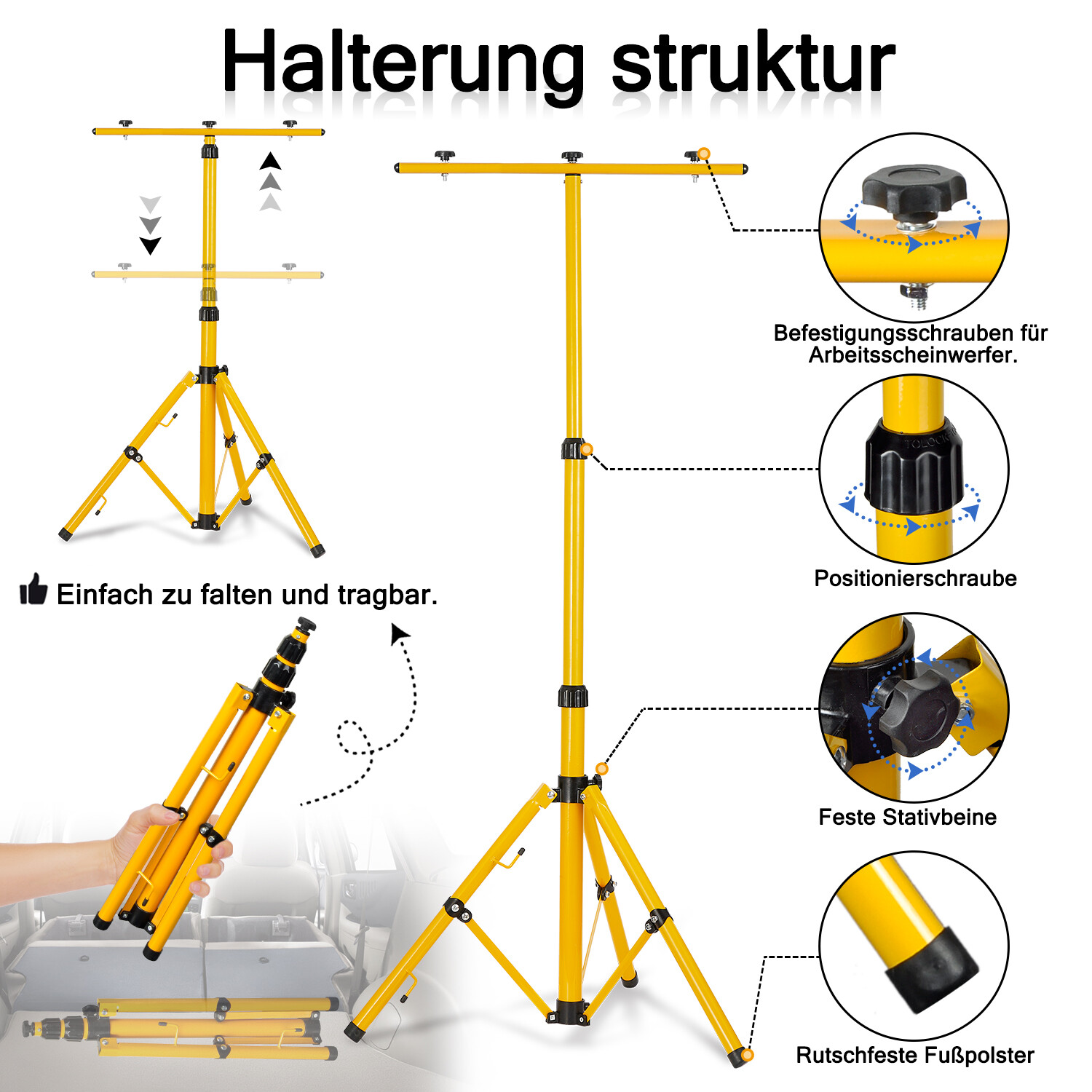 Brauchst du einen stabilen Halter für deine Baustrahler? Dieses gelbe Teleskop-Stativ aus Aluminium ist super praktisch! Höhe verstellbar von etwa 50 bis 150cm - also für verschiedene Einsätze geeignet. Ohne Werkzeug zusammenzubauen, und wenn's nicht gebraucht wird, einfach zusammenklappen. Die rutschfesten Gummifüße geben Halt, und die Dreibein-Konstruktion macht es richtig stabil. Du kannst einen oder sogar zwei Strahler gleichzeitig montieren. Perfekt für die Baustelle, in der Werkstatt, beim Camping oder wenn du mal im Garten feierst. Auch für Fotografen interessant, die ihre Ausrüstung improvisiert aufbauen müssen. Transport geht leicht, das Ding ist nicht zu schwer. So musst du deine Strahler nicht immer irgendwo hinlegen oder komisch anlehnen.