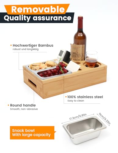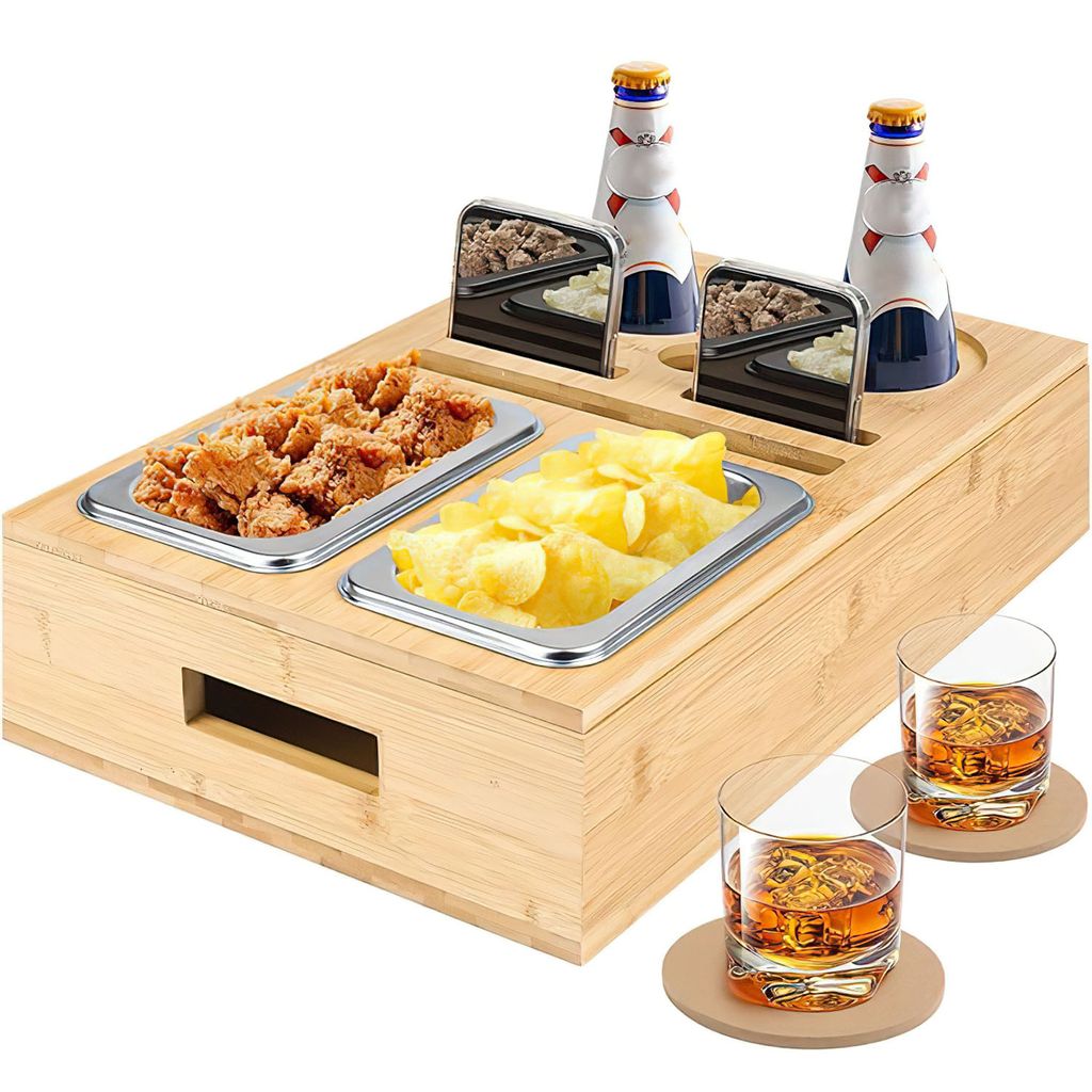 Der perfekte Couch-Begleiter! Diese Snackbox aus Bambus hält alles griffbereit. Mit 3 abnehmbaren Snackschalen für Knabbereien. Integrierte Halter für Getränke, Smartphone und Fernbedienung. Inklusive Flaschenöffner - praktisch für gemütliche Abende. Leicht zu reinigen, spülmaschinenfest. Perfekt für Wohnzimmer, Bett oder Auto. Macht jeden Filmabend komfortabler! Einfach aufstellen und entspannen ohne Aufstehen. Ideales Geschenk für Couch-Liebhaber.