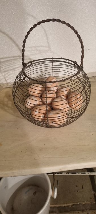 Dieser antike Eierkorb aus Draht ist einfach zeitlos schön! Mit seinem vintage Design passt er perfekt in jede Küche und bringt diesen rustikalen Charme mit, den man liebt. Aus robustem Draht gefertigt und in klassischem Schwarz lackiert, ist er nicht nur hübsch anzusehen, sondern auch super praktisch. Er fasst etwa 3 Dutzend Eier - ideal für alle, die frische Eier vom Bauernhof oder eigenen Hühnern haben. Aber das ist noch nicht alles: Du kannst ihn auch als Obstkorb, für Gewürze, Snacks oder einfach als Deko-Element verwenden. Mit seinem praktischen Griff ist er leicht zu tragen und überall zu platzieren. Ob auf dem Küchentisch, der Anrichte oder im Regal - dieser Korb macht immer eine gute Figur. Auch als Geschenk für Freunde und Familie super beliebt. Einfach, praktisch und wunderschön - mehr braucht's nicht!