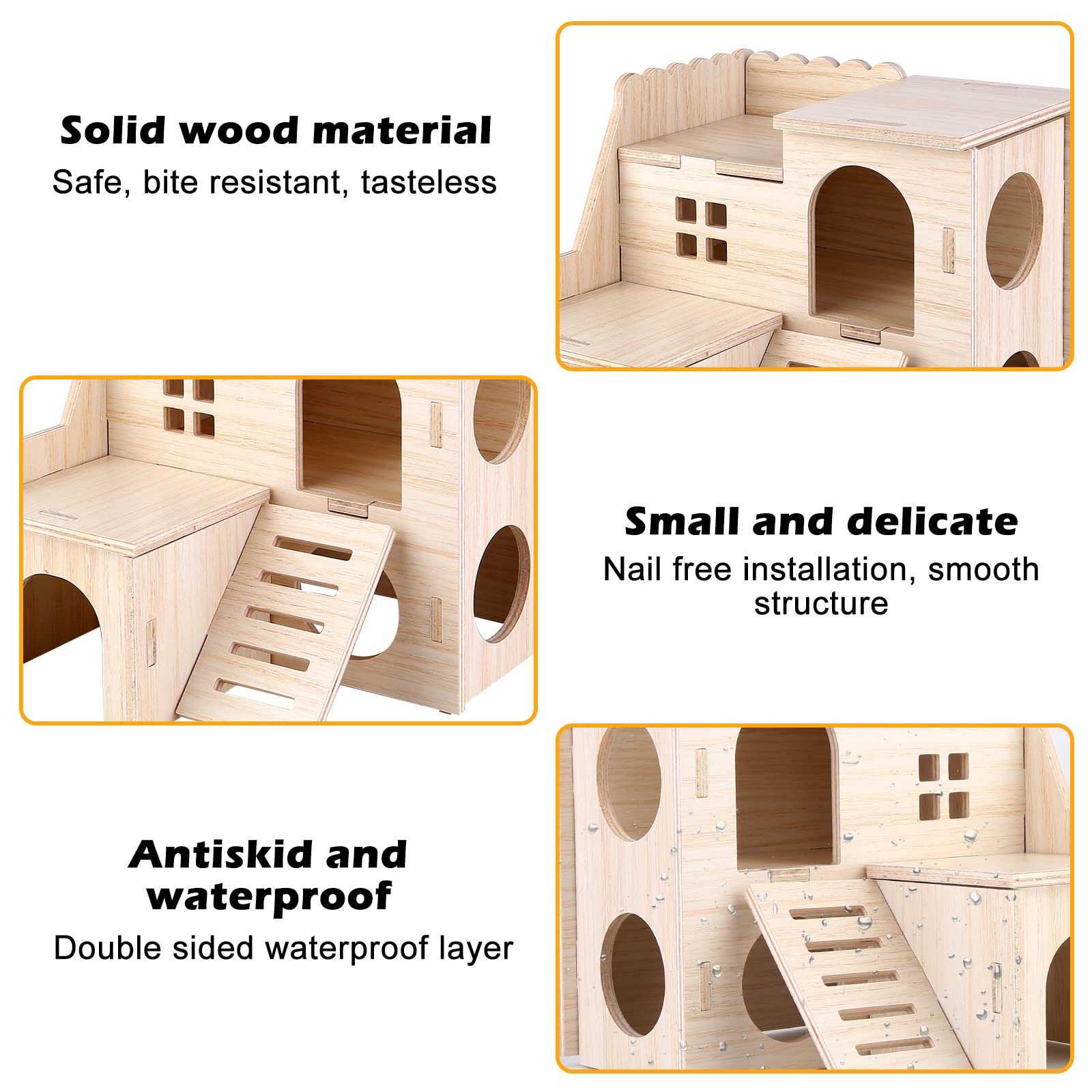 Dein Hamster wird dieses coole Eckhaus lieben! Aus natürlichem Holz gefertigt, bietet es mit 3 Räumen und 4 Verbindungslöchern jede Menge Platz zum Verstecken, Schlafen und Erkunden. Die Maße von 22.5x17.8x8cm passen in die meisten Käfige und die Eckenform spart Platz. Das abnehmbare Dach ermöglicht dir, jederzeit nach deinem Tier zu schauen. Einfach zusammenzubauen - macht sowohl dir als auch deinem kleinen Freund Spaß. Perfekt für Hamster, Mäuse, Rennmäuse und andere kleine Nager. Ein muss für jeden artgerechten Nagetier-Käfig!