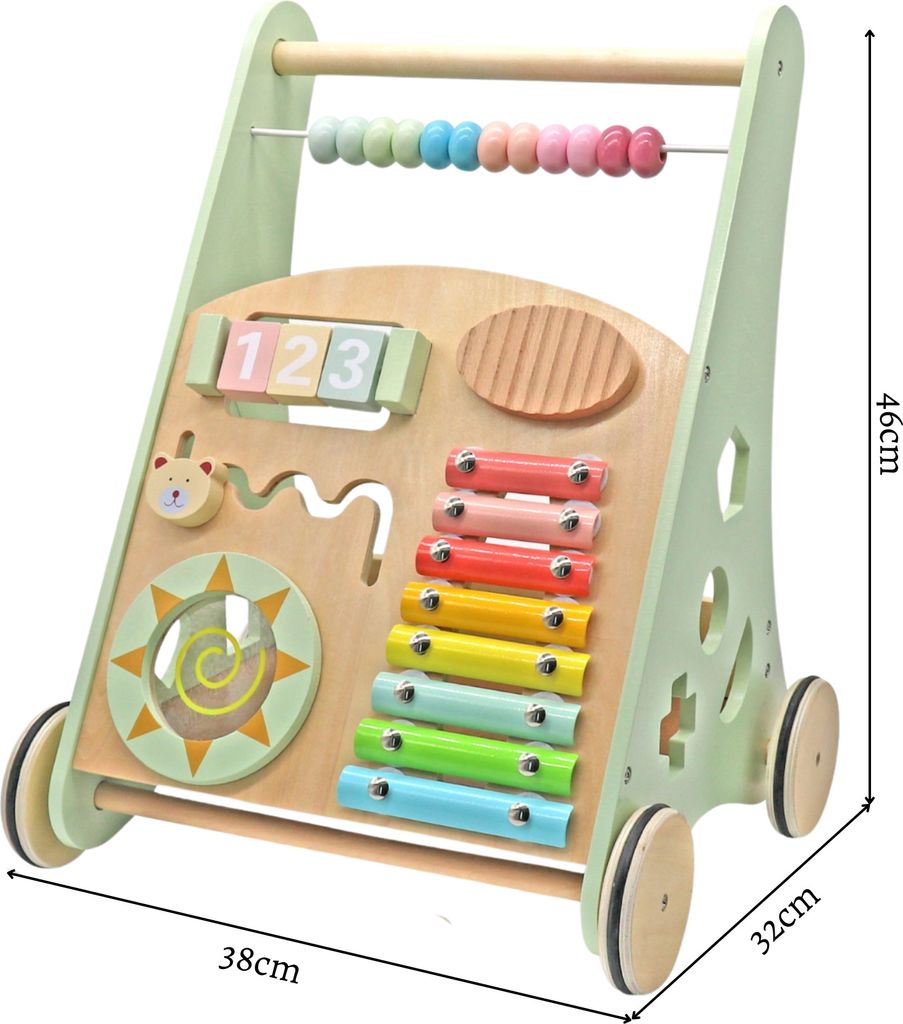 Dieser Nastopee Lauflernwagen ist so viel mehr als nur eine Lauflernhilfe! Das 9-in-1 Activity Center aus hochwertigem Holz bietet unendlich viele Spielmöglichkeiten für dein Kleines ab etwa 12 Monaten. Mit Drehspiegel, Zahnrädern, Labyrinth, Musik-Klopfinstrumenten und Formen-Zuordnungsspielen wird hier nie langweilig! Die rutschfesten Gummireifen mit 8cm Durchmesser geben dem Wagen super Stabilität und verhindern das Umkippen. Dein Kind kann ihn schieben, ziehen oder einfach damit spielen - ganz wie es möchte! Der geräumige Stauraum bietet Platz für Lieblingsspielzeug, und die einfache Montage macht den Aufbau zum Kinderspiel. Fördert spielerisch die motorische Entwicklung, Hand-Augen-Koordination und das räumliche Denken. Ein richtig durchdachtes Geschenk zur Geburt, zum Geburtstag oder zu Weihnachten - da strahlen nicht nur die Kleinen!