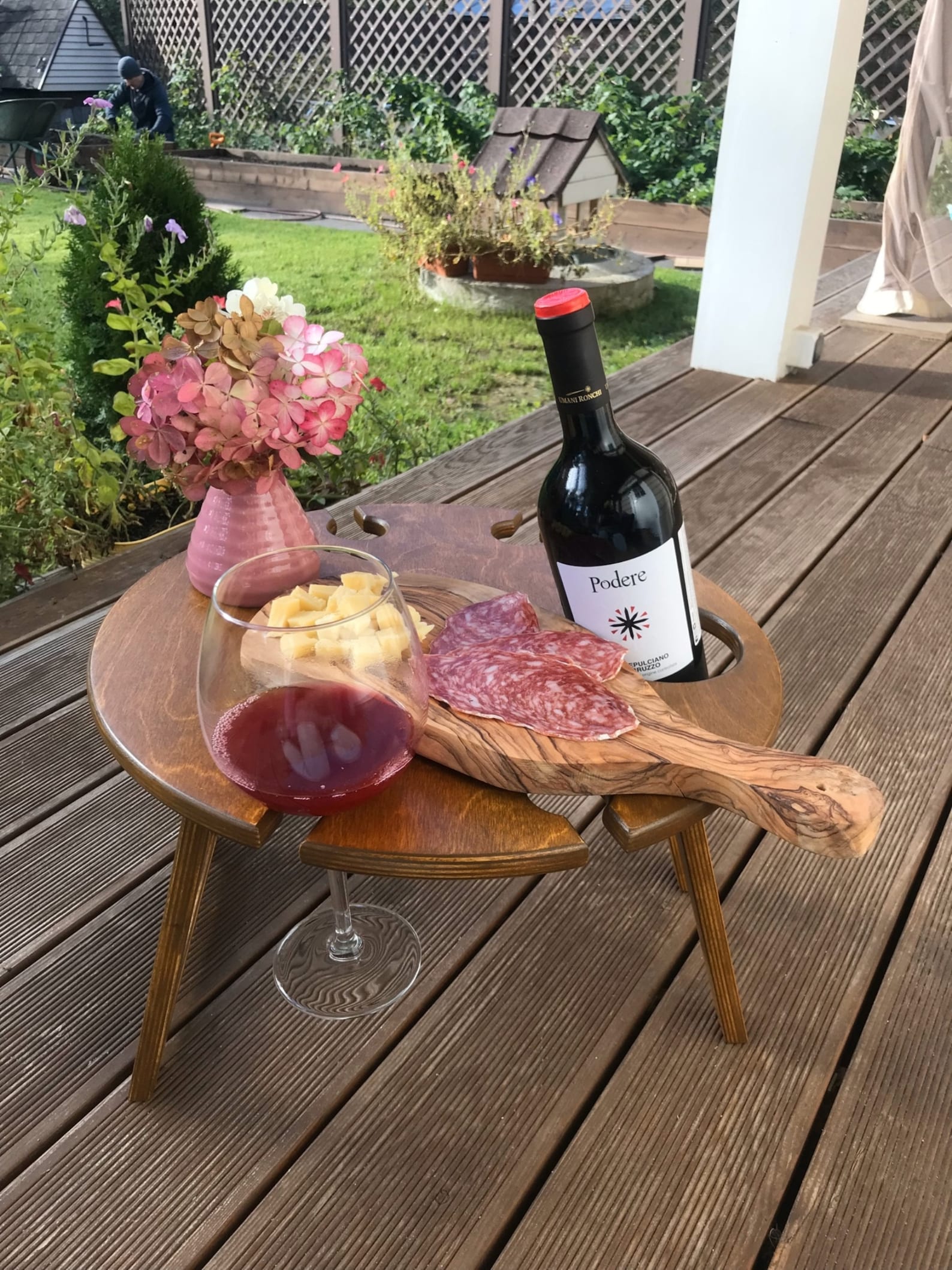 Wein genießen war noch nie so stilvoll! Dieser tragbare Weintisch aus Holz ist perfekt für Picknicks, Konzerte oder gemütliche Abende im Freien.\n\nProduktdetails:\n• Maße: 31x36x26cm\n• Material: Hochwertiges Holz\n• Farbe: Braun\n• 2 Weinglas-Halter\n• 1 Weinflaschen-Halter\n• Tragbarer Griff\n\nFeatures:\n• Abnehmbar - einfach zu transportieren\n• Stabile Konstruktion\n• Elegantes Holz-Design\n• Einfache Reinigung\n• Leicht zu montieren\n\nPerfekt für:\n• Wein-Picknicks im Park\n• Konzerte und Open-Airs\n• Strand-Ausflüge\n• Garten-Partys\n• Camping-Trips\n\nWarum dieser Tisch so praktisch ist:\n• Deine Gläser stehen sicher\n• Die Flasche ist gut verstaut\n• Genug Platz für Snacks\n• Passt in jeden Rucksack\n• Macht jedes Outdoor-Event stylischer\n\nOb für ein romantisches Date oder mit Freunden - mit diesem Weintisch wird jedes Outdoor-Erlebnis zum besonderen Event. Einfach aufbauen, Wein einschenken und genießen!