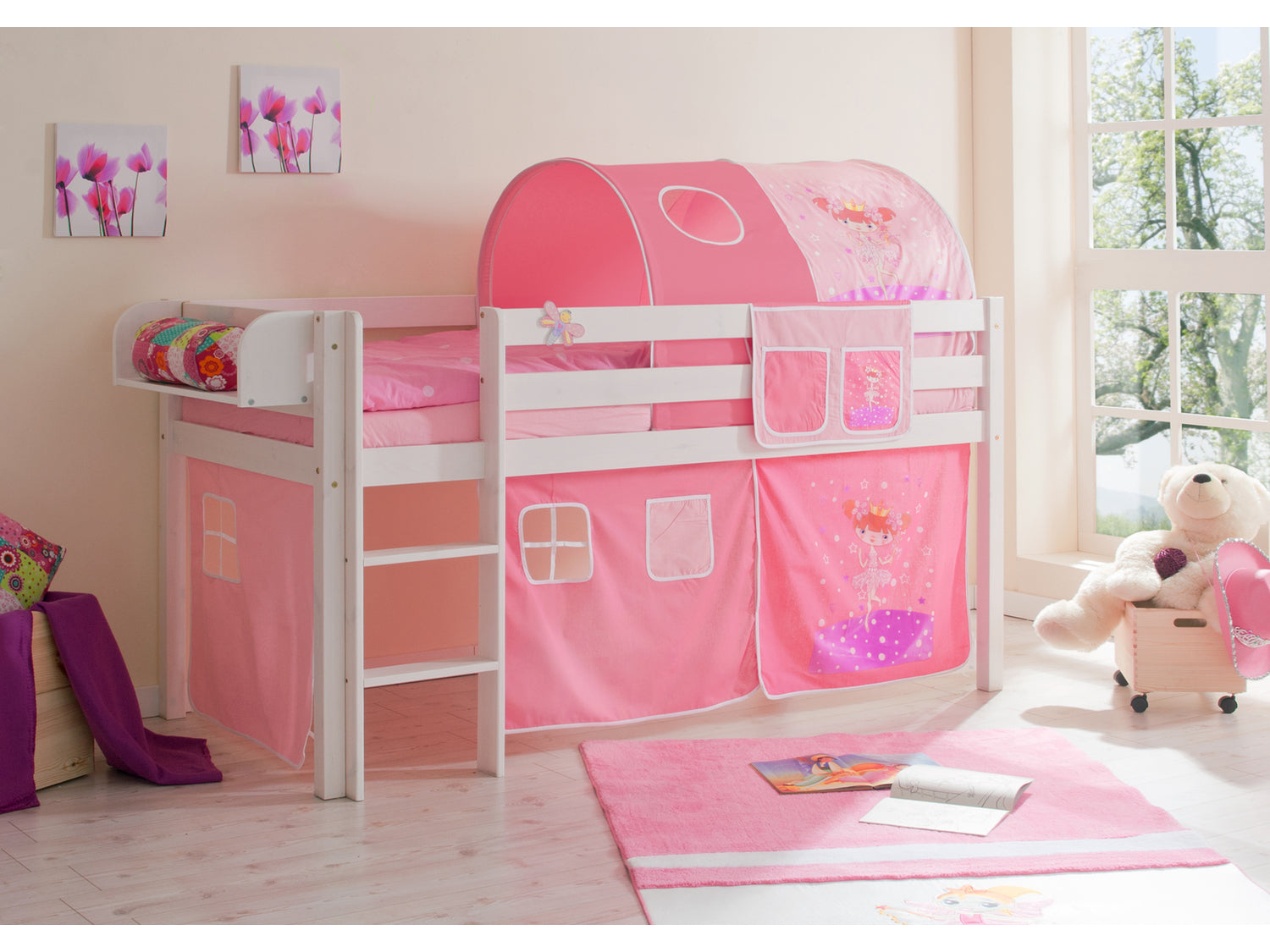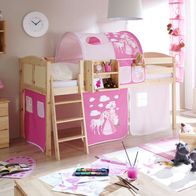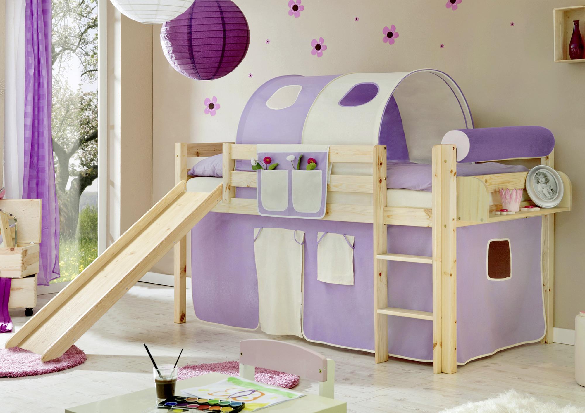 Hochbett Malte Aus Kiefer Massiv - Kinderbett Mit Vorhang In Lila/Beige