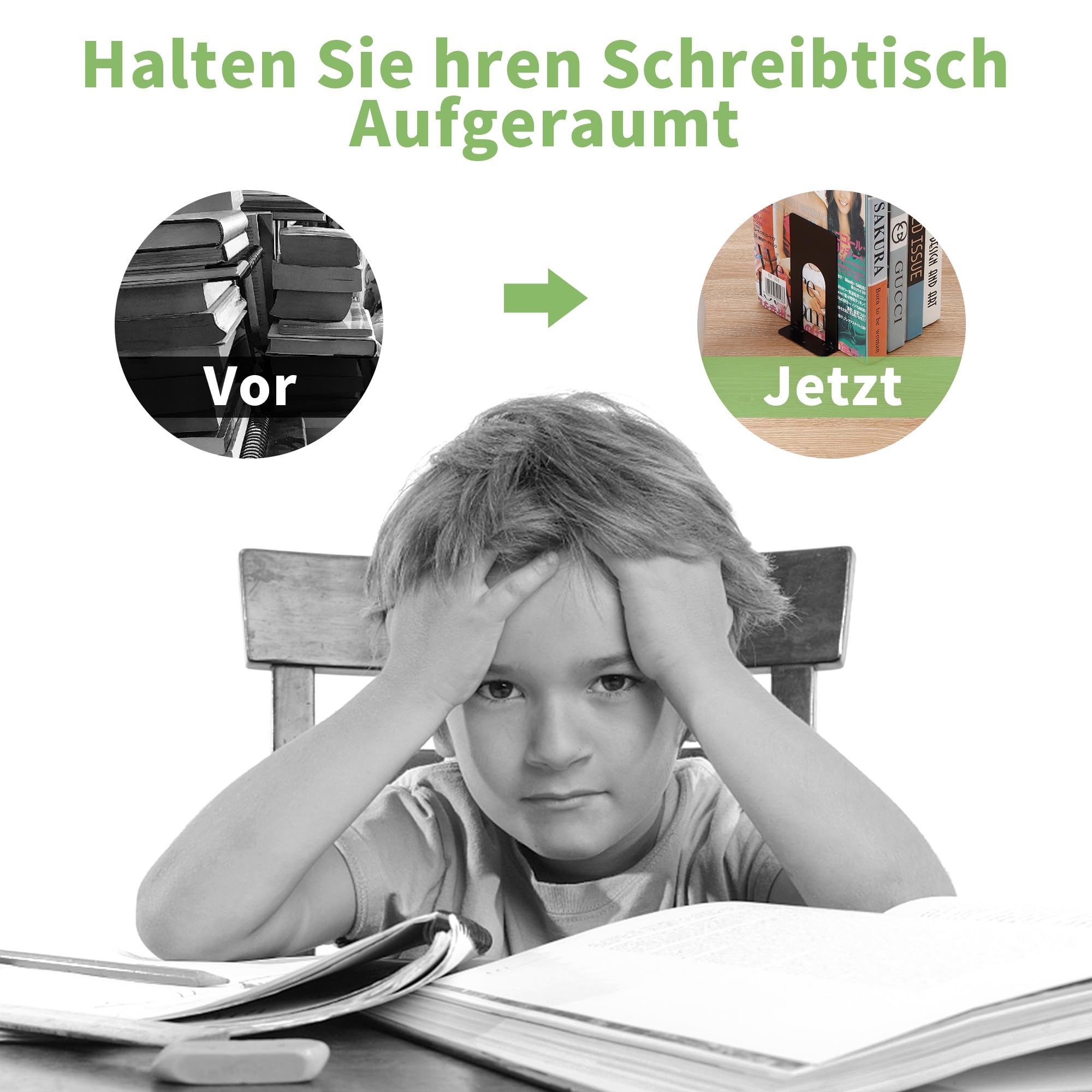 Schluss mit umfallenden Büchern! Diese 12 schwarzen Buchstützen aus Metall (je 69x100x130 mm) halten auch schwere Ordner sicher. Unten mit rutschfester Schaumstoffunterlage - kein Kratzer auf dem Tisch! Die Ecken sind abgerundet, super für die Hände. L-Form mit Dreiecksstabilität - stabil, aber unauffällig. Passt perfekt ins Regal, ins Büro oder ins Klassenzimmer. Auch für Zeitschriften, CDs oder Spiele. Modernes Design, rostfrei. Ein praktisches Geschenk für Studenten, Kollegen oder die Familie. Endlich Ordnung auf dem Schreibtisch!
