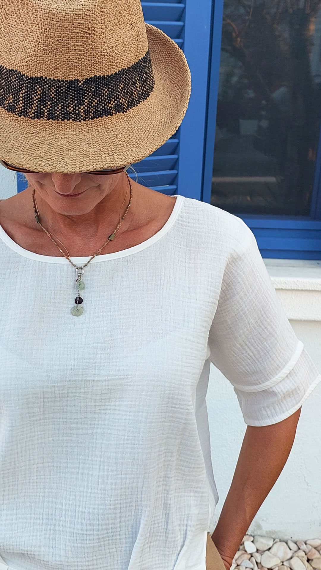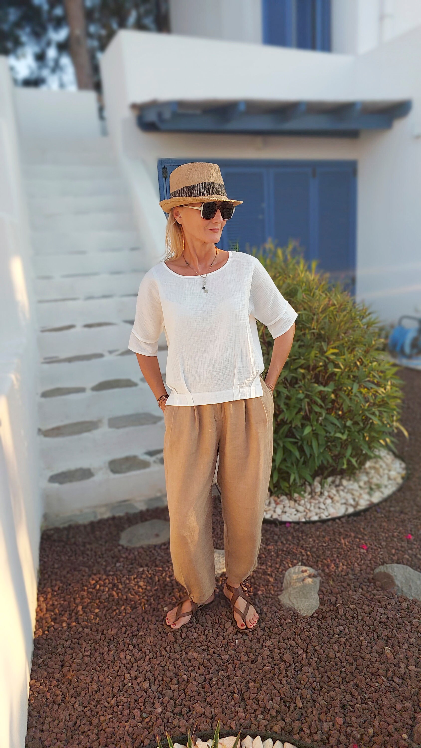 Bohemian-Chic für deinen Kleiderschrank! Diese lässige Bluse aus weichem Musselin mit Leinen-Anteil sitzt locker und bequem. Der dezentte V-Ausschnitt und die 3/4-Ärmel verleihen ihr einen romantischen Touch. Perfekt für Sommer und Übergangszeit - der natürliche Stoff ist atmungsaktiv und angenehm auf der Haut. In Übergröße erhältlich, schmeichelt jeder Figur. Einfach zu kombinieren mit Jeans, Röcken oder Shorts. Ob im Büro, beim Stadtbummel oder im Urlaub - diese Bluse ist dein neuer Lieblingsteil! Maschinenwaschbar und bügelfreundlich. Hol dir diesen zeitlosen Klassiker in verschiedenen Farben - ein Must-have für jede modebewusste Frau!