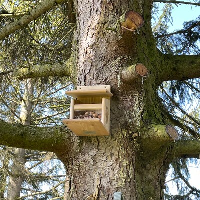 Mit 3 Eintrittslöchern von je 7cm Durchmesser - so kommen die Eichhörnchen easy rein und raus. Wichtig: Das Haus sollte etwa 3-4 Meter über dem Boden hängen und nah an einem Ast sein, falls mal Gefahr droht und sie schnell flüchten müssen.