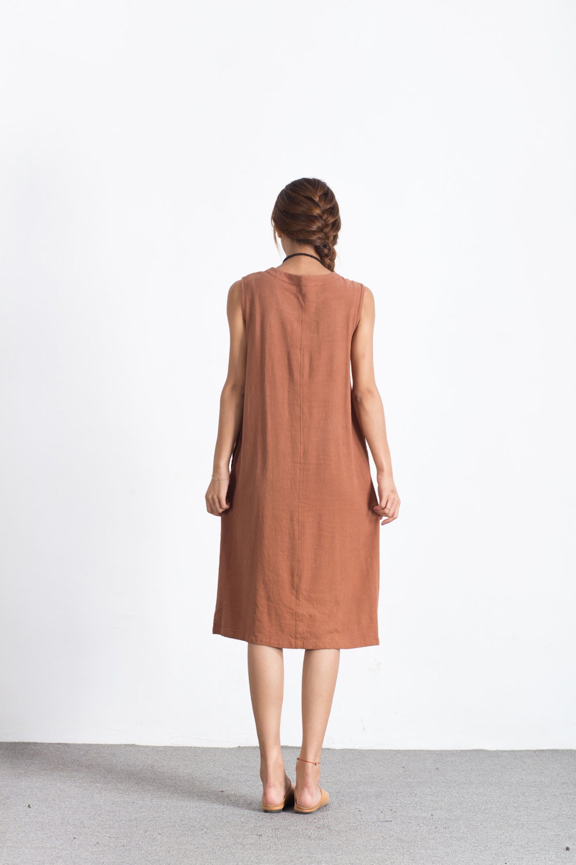 Damen Leinenkleid Maxi - ärmellos Mit V-Ausschnitt - Boho Sommerkleid Fließend - Strandkleid Lässig
