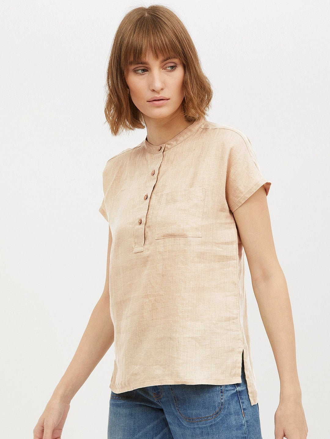 Dieses Damen-T-Shirt mit V-Ausschnitt und Knopf-Detail ist ein echter Allrounder für deinen Kleiderschrank! Aus hochwertiger, atmungsaktiver Baumwolle gefertigt, fühlt es sich weich und angenehm auf der Haut an - perfekt also für warme Sommertage oder unter Blazern im Büro. Der dezent elegante V-Ausschnitt betont dein Dekolleté auf schmeichelhafte Weise, ohne zu aufdringlich zu wirken. Die praktischen Knöpfe geben dem Top einen besonderen Look und machen es zum Eyecatcher in jeder Kombination. Ob mit Jeans für einen lässigen Alltagslook, mit einem Rock für einen eleganteren Auftritt oder unter einer Jacke fürs Office - dieses Top passt immer! Die kurzen Ärmel sorgen für Bewegungsfreiheit, und der bequeme Schnitt schmeichelt jeder Figur. Besonders praktisch: Es ist pflegeleicht und behält auch nach häufigem Waschen seine Form und Farbe. In verschiedenen Farben und Größen erhältlich - da findest du sicher deinen Favoriten! Ein Must-have für jede modebewusste Frau, die Wert auf Komfort und Stil legt. Hol es dir jetzt und entdecke neue Kombinationsmöglichkeiten für deine Outfits!