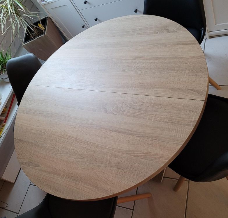 Perfekte Lösung für kleine Räume! Dieser ausziehbare Esstisch von Kebnor verwandelt sich im Handumdrehen von einem gemütlichen Rundtisch für 4 Personen zu einem großen Ovattisch für 6 Personen. Einfach die Tischplatte herausziehen und schon hast du 40 cm mehr Platz!\\n\\nMit 118 cm Durchmesser ist der Tisch perfekt für kleine Küchen oder Essbereiche. Ausgezogen auf 158 cm Länge bietet er reichlich Platz für Familienessen oder Gäste. Die Höhe von 76,8 cm ist ideal für entspanntes Essen.\\n\\nDas geniale Stauraum-Konzept: Unter der Tischplatte befinden sich zwei Ebenen Stauraum mit gebogenen Schiebetüren. Perfekt für Geschirr, Besteck oder Deko - alles ordentlich verstaut und griffbereit!\\n\\nTechnische Daten:\\n- Größe: 118 cm Ø (ausgezogen 158 x 118 cm)\\n- Höhe: 76,8 cm\\n- Material: MDF in Nussbaum-Optik\\n- Max. Belastung: 75 kg\\n- Gewicht: 43,2 kg\\n\\nDie 6 verstellbaren Füße sorgen für stabilen Stand auch auf unebenen Böden. Ob in der Küche, im Esszimmer oder auf dem Balkon - dieser Tisch findet überall seinen Platz.\\n\\nMontage erforderlich, aber einfach - in ca. 30 Minuten ist alles aufgebaut. Der Tisch kommt in 2 Paketen und wird mit deutscher Anleitung geliefert.\\n\\nStylisch, praktisch und platzsparend - der ideale Tisch für moderne Haushalte!