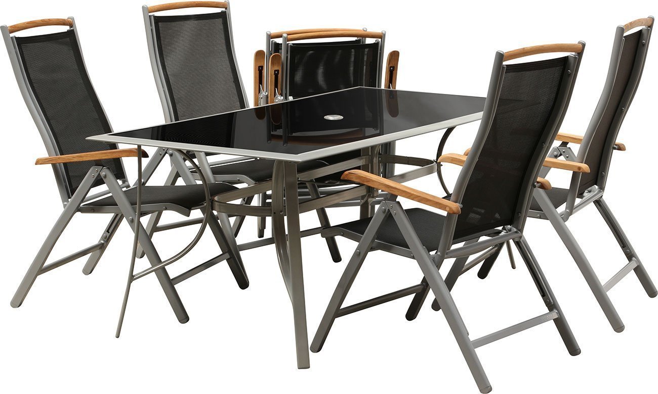 Perfekte Gartenmöbel für deine Terrasse! Dieses Diplomat-Set hat alles: Ausziehtisch von 90 auf 180 cm - Platz für bis zu 8 Personen! Mit edler Sicherheitsglasplatte in Schwarz, super leicht zu reinigen. Die Stühle mit Teakholz-Armlehnen und Textilengewebe - mega bequem auch ohne Kissen. Aus pulverbeschichtetem Aluminium - rostfrei und witterungsbeständig. Stühle sind stapelbar und werden montiert geliefert. Tisch hat Stellschrauben für unebenen Untergrund. Belastbar bis 120 kg pro Stuhl. Einfache Montage - nur Tischbeine anbringen. Macht deinen Garten zur Wohlfühloase!