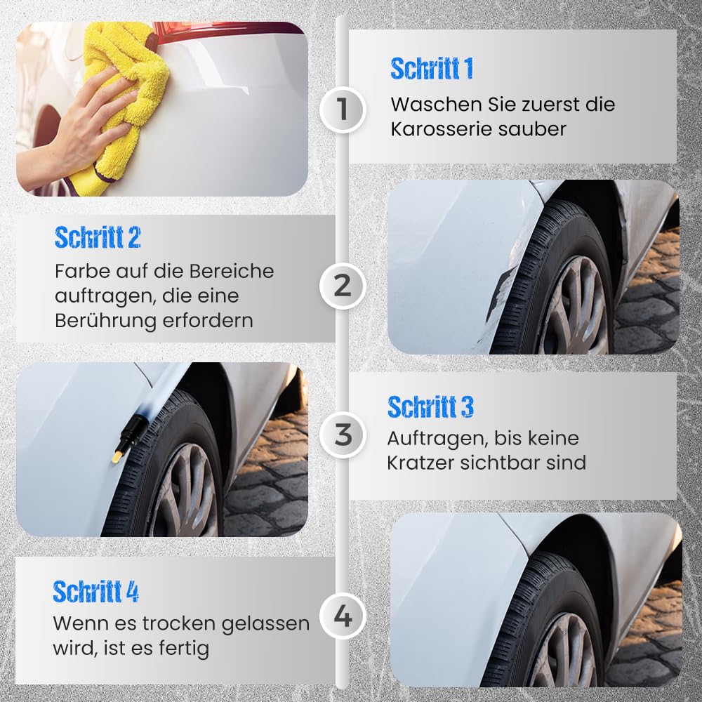 Ärgerliche Kratzer im Autolack? Dieser Magic Pen ist deine Rettung! Mit der superpräzisen Spitze trägst du den Lackstift punktgenau auf und die Kratzer sind quasi unsichtbar. Die Formel trocknet blitzschnell und ist absolut wasserfest - hält also auch bei Regen und Sonne. Einfach den Bereich reinigen, den Stift auftragen und trocknen lassen. Selbst als Anfänger kriegst du das hin! Funktioniert übrigens nicht nur am Auto, sondern auch an Möbeln, Elektrogeräten und Spiegel. Mit 7,4 ml Inhalt hast du genug für mehrere Reparaturen. Viel günstiger als eine Werkstatt - probier's aus!