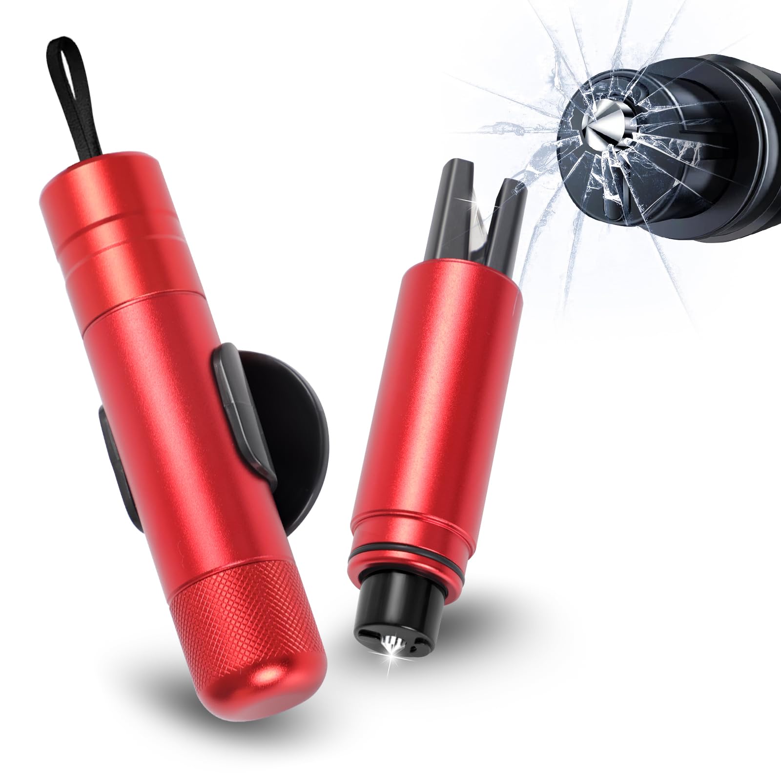 Sicherheit geht vor! Diese 2 Notfallhammer könnten im Ernstfall Leben retten. Mit integriertem Gurtschneider - im Notfall einfach den Sicherheitsgurt durchtrennen. Der Wolfram-Stahlhammer hat eine Härte von 65 HRC - zerschmettert Autofenster mit nur 6kg Druckkraft! Super einfach zu bedienen: Schutzkappe abnehmen, aufs Glas drücken - schon bricht es. Der U-förmige Gurtschneider aus Edelstahl schneidet Sicherheitsgurte, ohne die Hände zu verletzen. Kompakt und tragbar - passt in Handschuhfach, Türfach oder an den Schlüsselbund. Mit Klebehalterung für festen Sitz im Auto. Farbe: Schwarz/Rot - gut sichtbar. Auch für ältere Menschen, Frauen und Kinder einfach zu bedienen. Ein absolutes Muss für jedes Auto! Inhalt: 2x Nothammer. Mach dein Auto sicherer - hoffentlich brauchst du ihn nie!