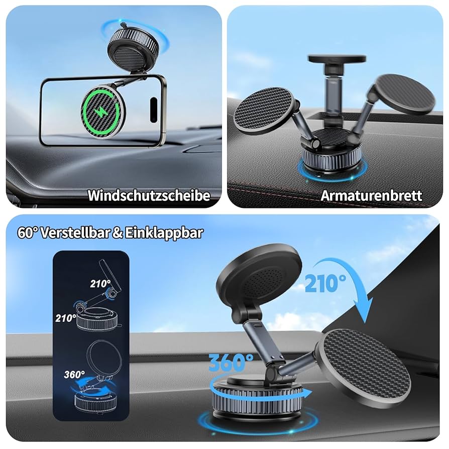Innovativ und praktisch! Dieser Handyhalter mit Vakuum-Saugtechnik hält dein Smartphone sicher im Auto. Mit 15W kabellosem Laden und Kühlfunktion gegen Überhitzung. 360° drehbar für perfekte Sicht, automatische Saugfunktion. Kompatibel mit iPhone 12-16 Serie (mit Magnetring). Einfach an der Windschutzscheibe befestigen und schon kannst du sicher navigieren und laden!