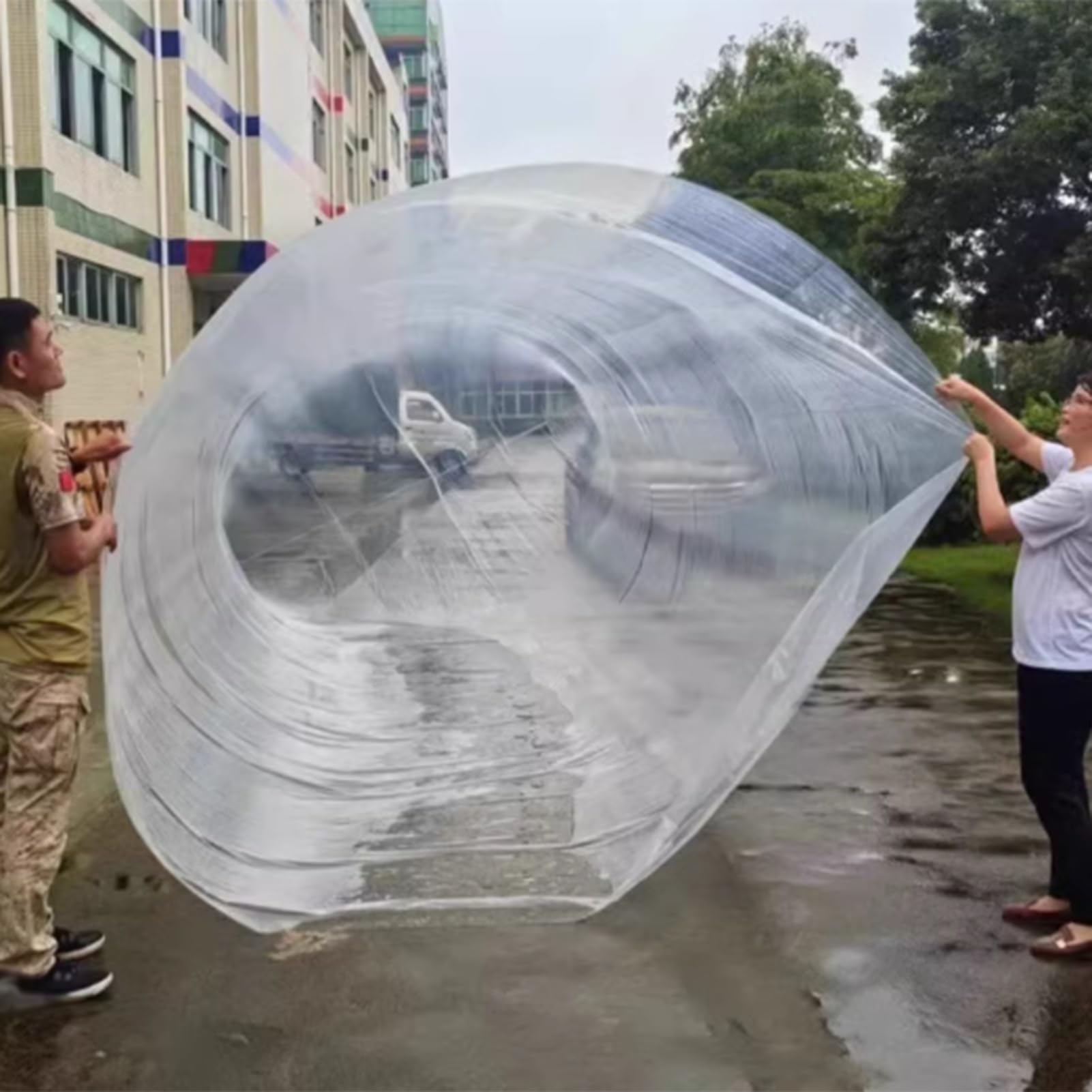 Parkst du dein Auto draußen? Diese aufblasbare Autoabdeckung ist wie eine schützende Blase um deinen Wagen! Schützt vor Hagel, Regen, Schnee und sogar vor Überschwemmungen. Aus robustem PE-Material mit 0,18mm Stärke - hält echt was aus! Maße 4x7m (13,1x22,9 Fuß) passen für die meisten Familienautos, ob Limousine oder SUV. Einfach aufblasen, Auto reinfahren und sich sicher fühlen! Viel besser als diese herkömmlichen Abdeckplanen, die oft scheuern oder wegfliegen. Die transparente Hülle lässt noch Licht durch und du kannst dein Auto immer sehen. Perfekt für zu Hause ohne Garage, Camping-Ausflüge oder wenn mal wieder ein Unwetter angesagt ist. Einfach aufbauen, Auto schützen und beruhigt schlafen - dein Auto ist sicher vor den Elementen! Kein lästiges Abdecken mit Planen mehr - diese Luftpolster-Lösung ist modern, effektiv und mega praktisch!