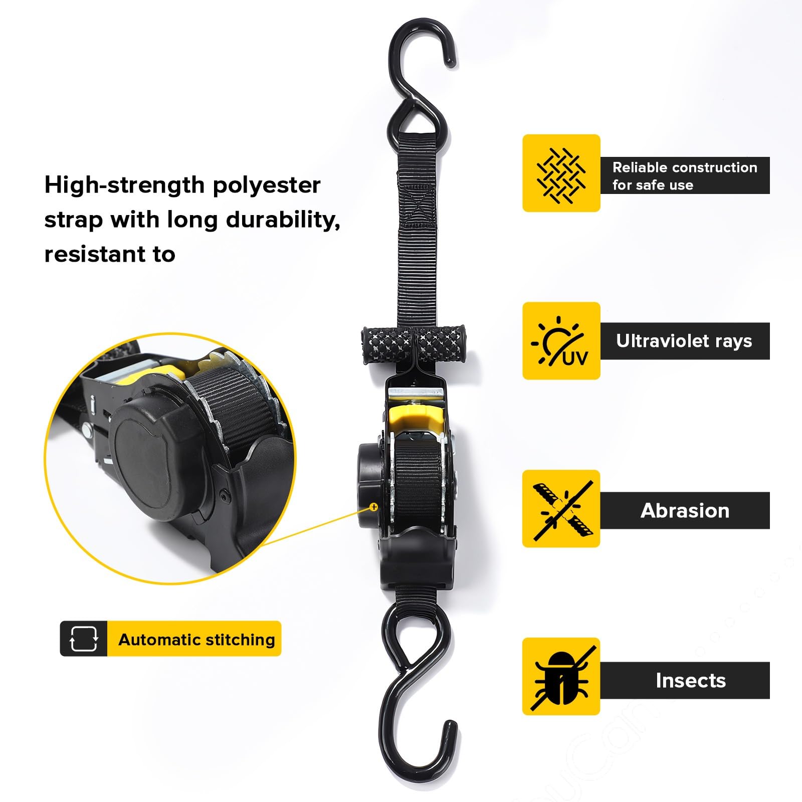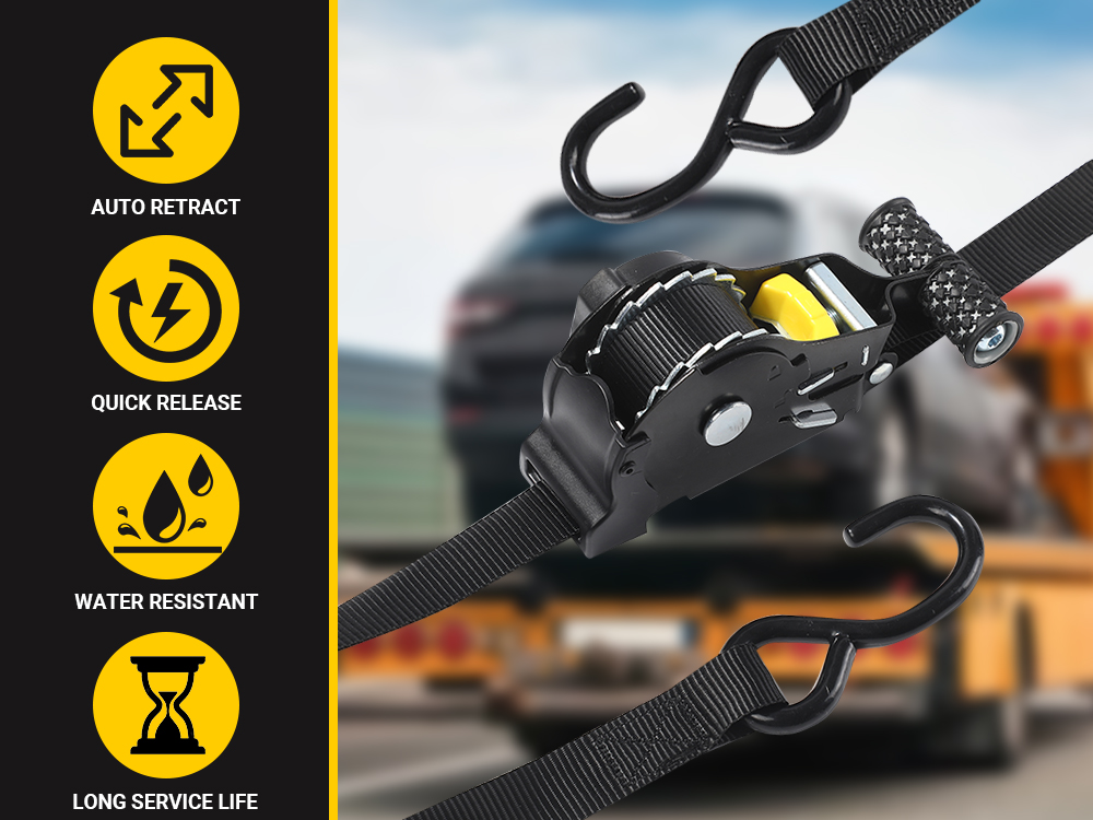 Wow, diese Spanngurte sind ja mal richtig praktisch! Mit der automatischen Ratsche musst du nicht mehr mühselig am Gurt ziehen – einfach den Knopf drücken und schon rollt sich das Band von selbst auf. So sparst du dir ne Menge Zeit und Ärger beim Sichern deiner Ladung.