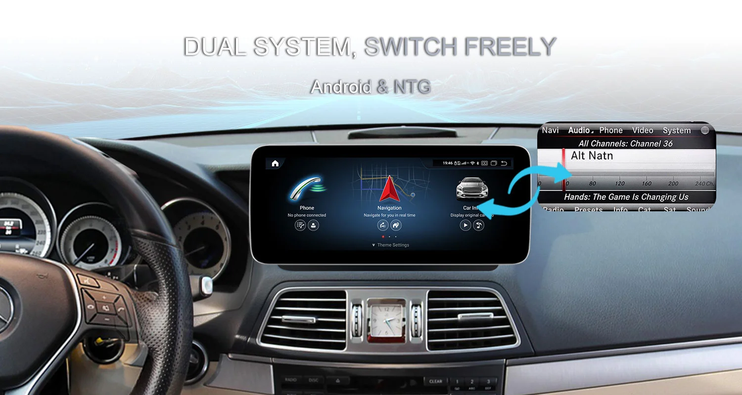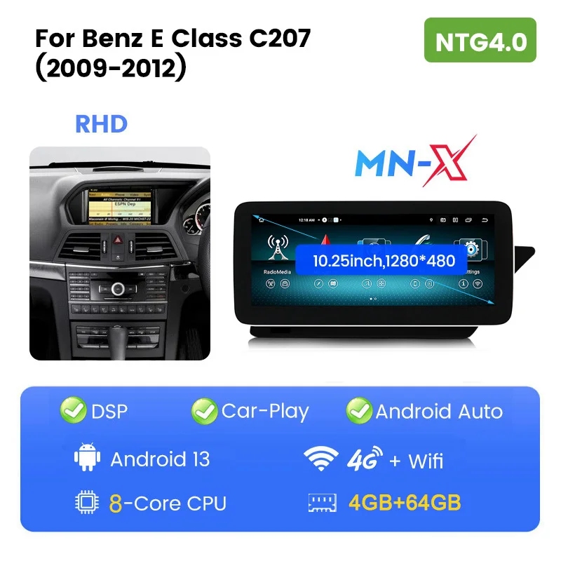 Upgrade für deinen Mercedes! 10,25 Zoll IPS Touchscreen mit Android 13. Acht-Kern Prozessor, 4GB RAM, 64GB Speicher. Integriertes GPS, Bluetooth 5.0, WiFi. Wireless Apple CarPlay & Android Auto. Kompatibel mit Mercedes E-Klasse W207/C207/A207 2009-2012 mit NTG 4.0. Behält originale Funktionen wie Lenkradbedienung bei. Zeigt Fahrzeuginformationen an. DSP für perfekten Sound. Unterstützt Rückfahrkamera und DAB+. Einfache Installation - plug & play. Macht dein Auto zum rollenden Entertainment-Center. Einfach bestellen und installieren lassen!