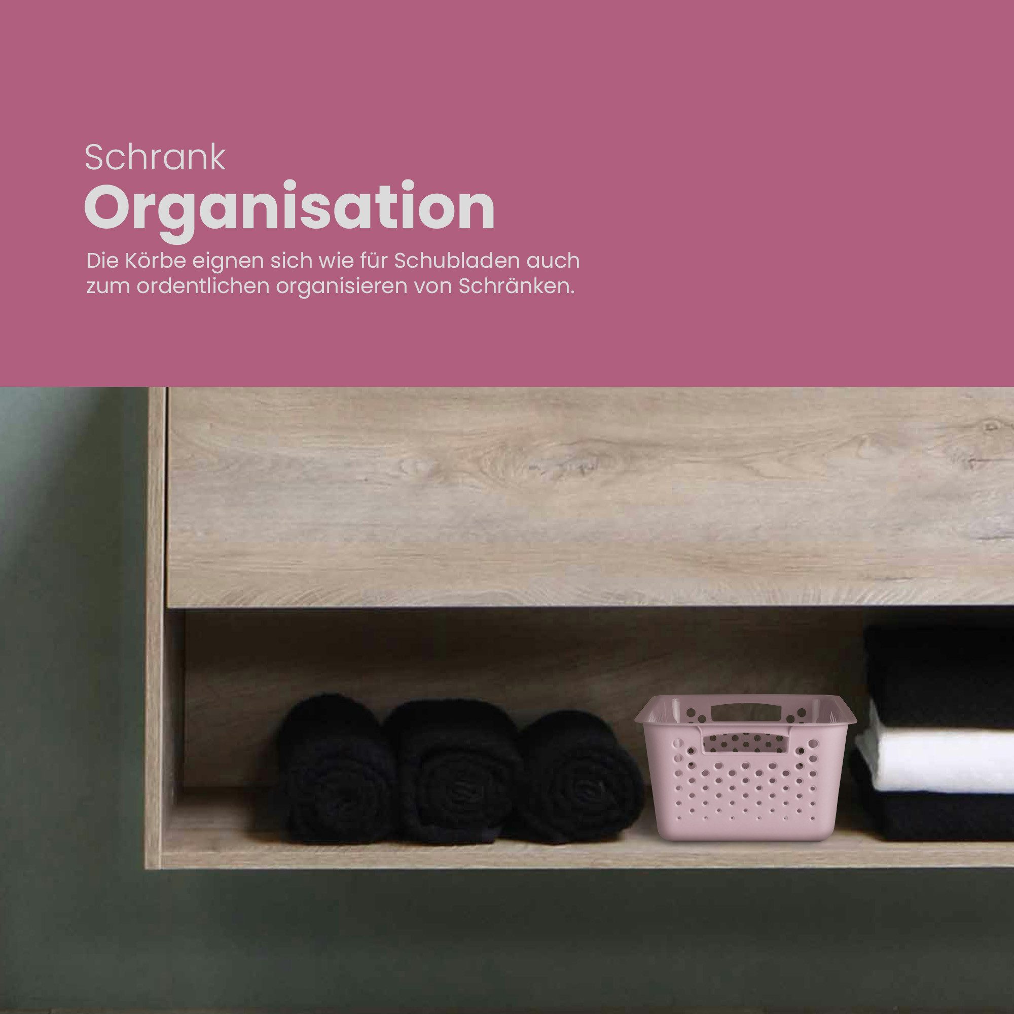 Perfekt für Schubladen, Schränke, Bad, Küche oder Kinderzimmer. Die Lochung sorgt für gute Belüftung und du siehst gleich, was drin ist. Maße: 30x20x11 cm pro Korb.