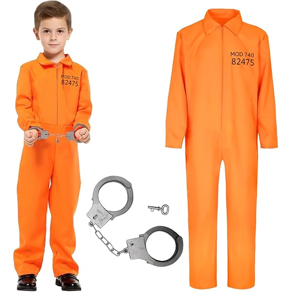 Ab ins Gefängnis - aber nur zum Spaß! Dieses 4-teilige Prisoner Kostüm-Set verwandelt dein Kind in einen echten Knast-Insassen. Perfekt für Halloween, Karneval oder Mottopartys! 🎭🔒\n\nIm Set ist alles dabei, was ein richtiger Sträfling braucht: Der typische orange Gefängnis-Overall mit Reißverschluss vorne (super einfach an- und auszuziehen), ein Paar coole Handschellen MIT Schlüssel (sehr wichtig!), ein Gefangenen-Nummern-Aufkleber und ein Tattoo-Aufkleber für den ultimativen Knast-Look.\n\nDas Besondere: Das Nummernschild kannst du selbst beschriften! So wird das Kostüm ganz persönlich und das Rollenspiel macht noch mehr Spaß.\n\nAus weichem, atmungsaktivem Polyester gefertigt ist der Overall angenehm zu tragen und gibt genug Bewegungsfreiheit für ausgelassenes Feiern. Die Qualität ist top - die Nähte halten auch bei wildem Herumtoben.\n\nIn drei Unisex-Größen erhältlich: 130, 140 und 150 cm. Einfach die Größentabelle checken und die passende Größe für dein Kind wählen.\n\nOb für Jungen oder Mädchen - dieses Kostüm kommt immer gut an. Die auffällige orange Farbe sorgt dafür, dass dein Kind nicht übersehen wird!\n\nNicht nur für Partys geeignet: Der Overall kann auch als Arbeitskleidung oder für Theateraufführungen verwendet werden.\n\nEinfach in der Maschine waschbar - nach der Party ist alles schnell wieder sauber. Bestell noch heute und bereite deinem Kind eine riesige Freude! Das wird der Hit auf jeder Party! 🎉