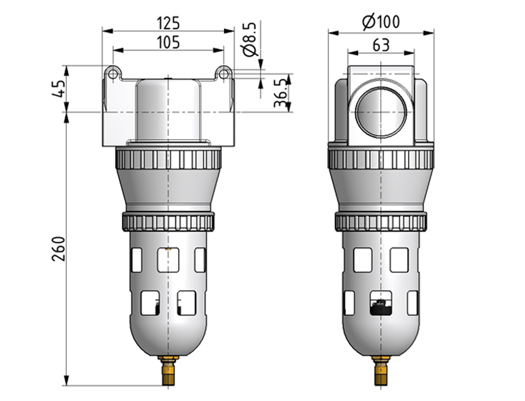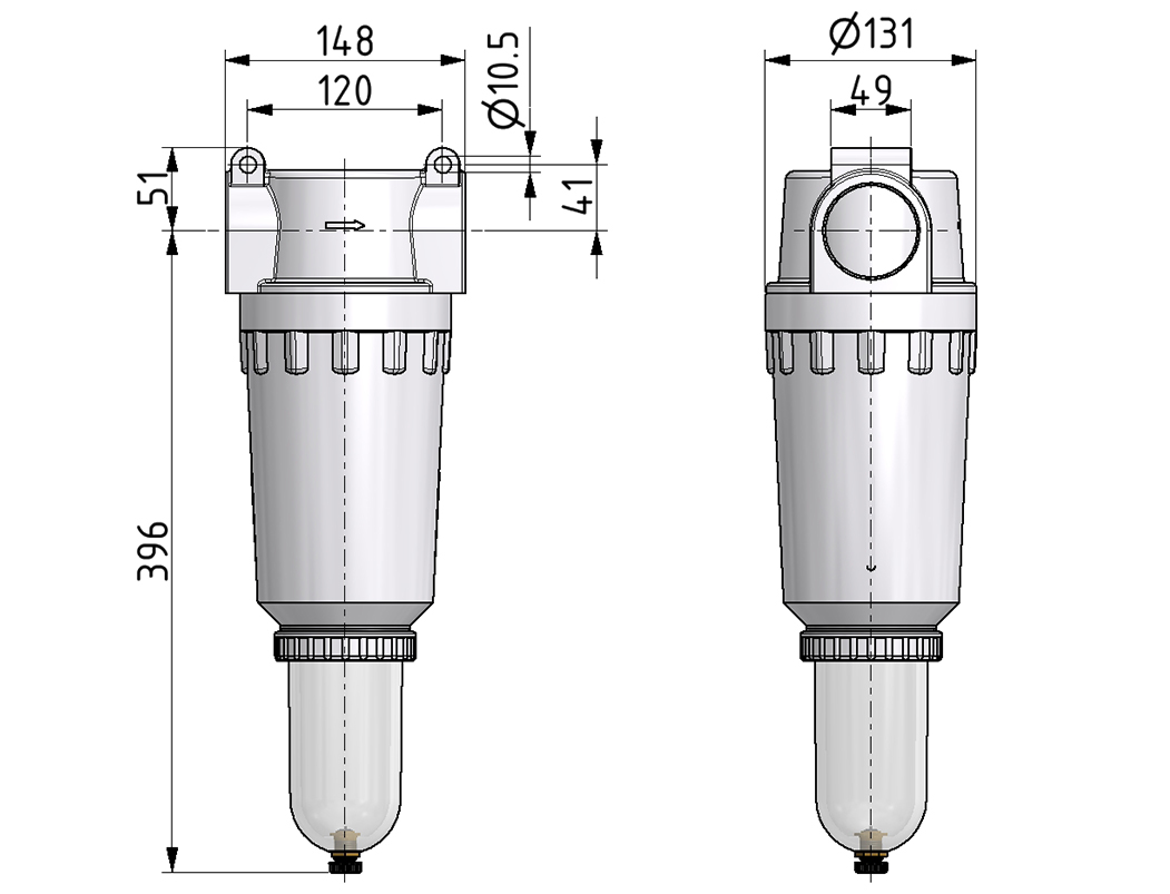 Mit einem 5μm Messing-Filterelement filtert er zuverlässig Verunreinigungen aus der Druckluft. Der maximale Arbeitsdruck liegt bei 10 bar (145 PSI), und die Durchflussmenge beträgt satte 70 CFM - also mehr als genug für die meisten Anwendungen.