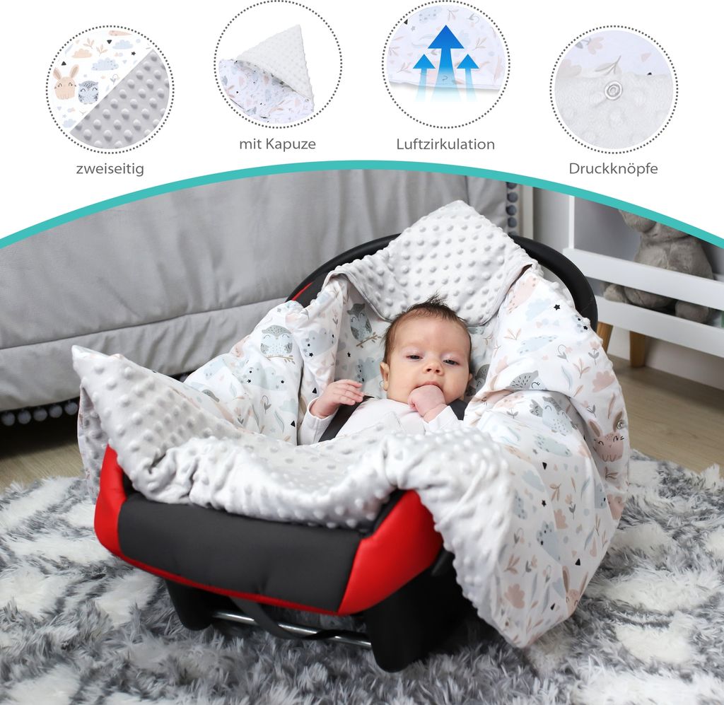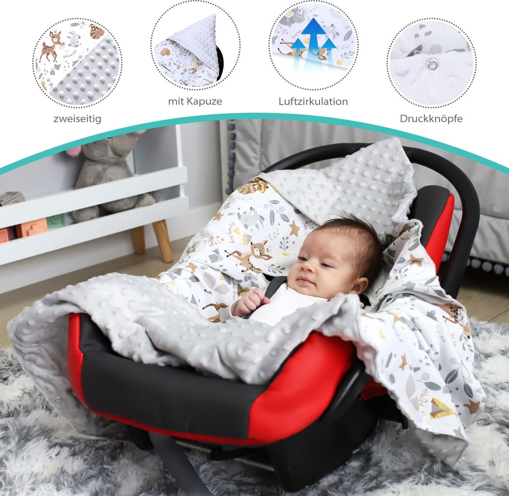 Pucken war noch nie so einfach! Diese praktische Einschlagdecke ist der Alleskönner für dein Baby. Mit 90x90 cm passt sie perfekt in Babyschalen, Kinderwagen und Autositze mit 3-Punkt-Gurtsystem.
