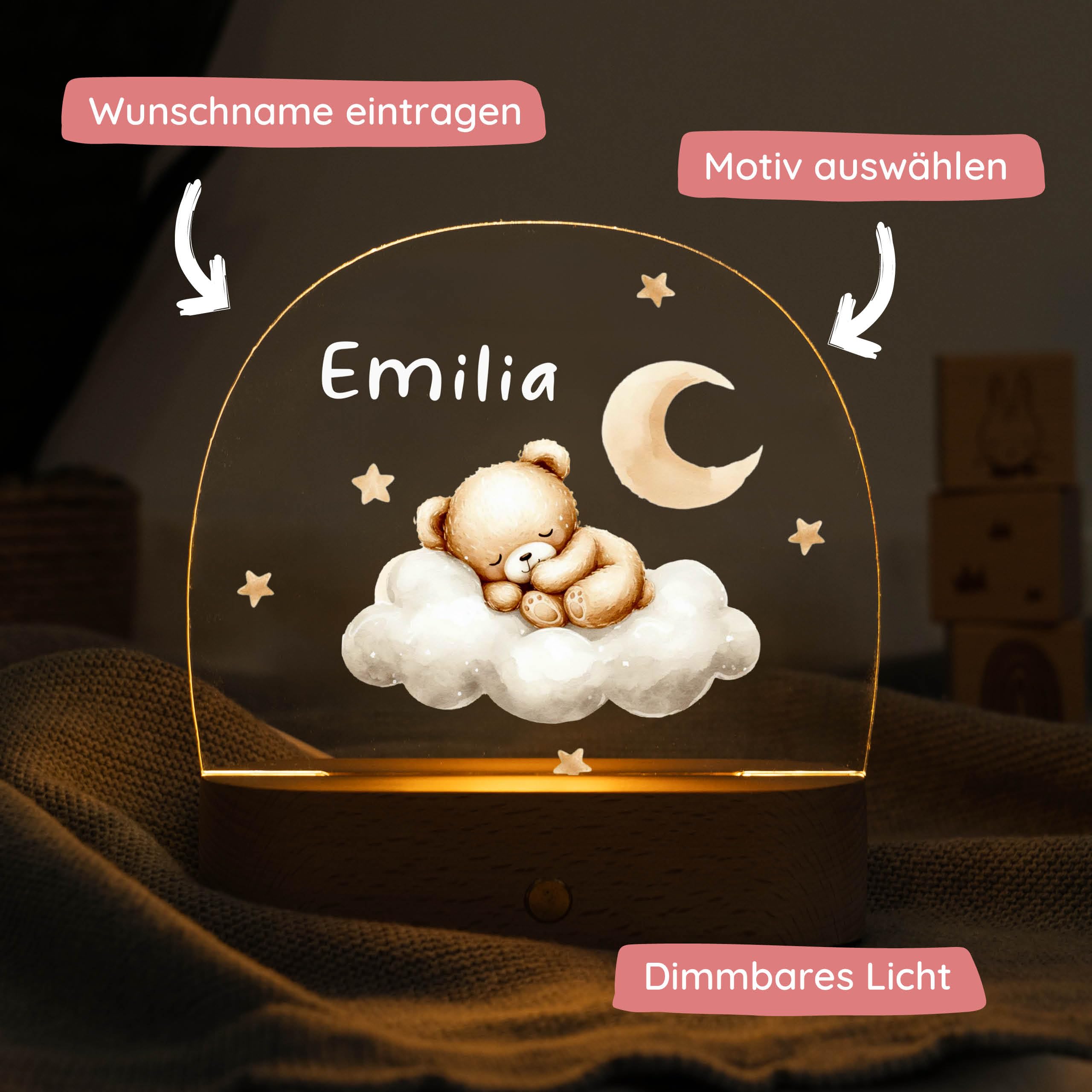 Oh wie süß! Dieses personalisierte Nachtlicht fürs Kinderzimmer ist einfach nur niedlich. Mit Weihnachtsmotiv und dem Namen deines Kindes wird es zum ganz besonderen Stück. Dimmbar und mit 3 Lichtfarben für die perfekte Stimmung beim Einschlafen. Aus Acrylglas und Holz - schadstofffrei und sicher. Per USB betrieben und super einfach zu bedienen. Ob als Geschenk zur Geburt, Taufe oder zu Weihnachten - dieses Nachtlicht begleitet dein Kind durch viele Träume. Einfach anschließen und strahlen lassen!