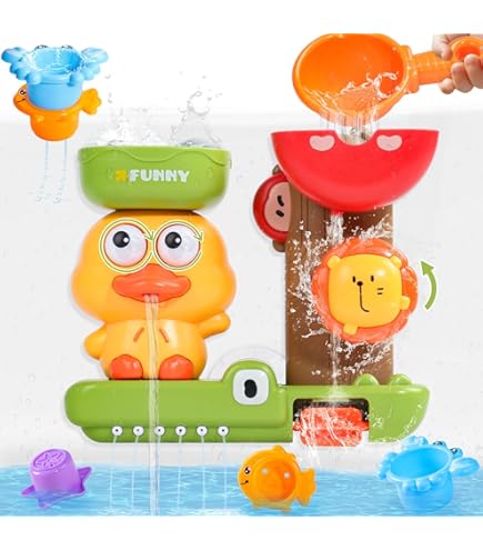 Badespaß garantiert! Dieses niedliche Badespielzeug-Set begeistert kleine Wasserratten ab 18 Monaten. Mit starken Saugnäpfen haftet es sicher an Badewanne und Fliesen. Einfach Wasser in den Behälter füllen und schon entsteht ein faszinierender Wasserfall-Effekt. Die süße Ente und das Wasserrad drehen sich lustig mit. Ohne Batterien und mit abgerundeten Kanten absolut sicher für die Kleinen. Perfekt für Badewanne, Planschbecken oder Wasserspiel-Tisch. In edler Geschenkbox verpackt - das ideale Geschenk für Geburtstage, Weihnachten oder einfach so!