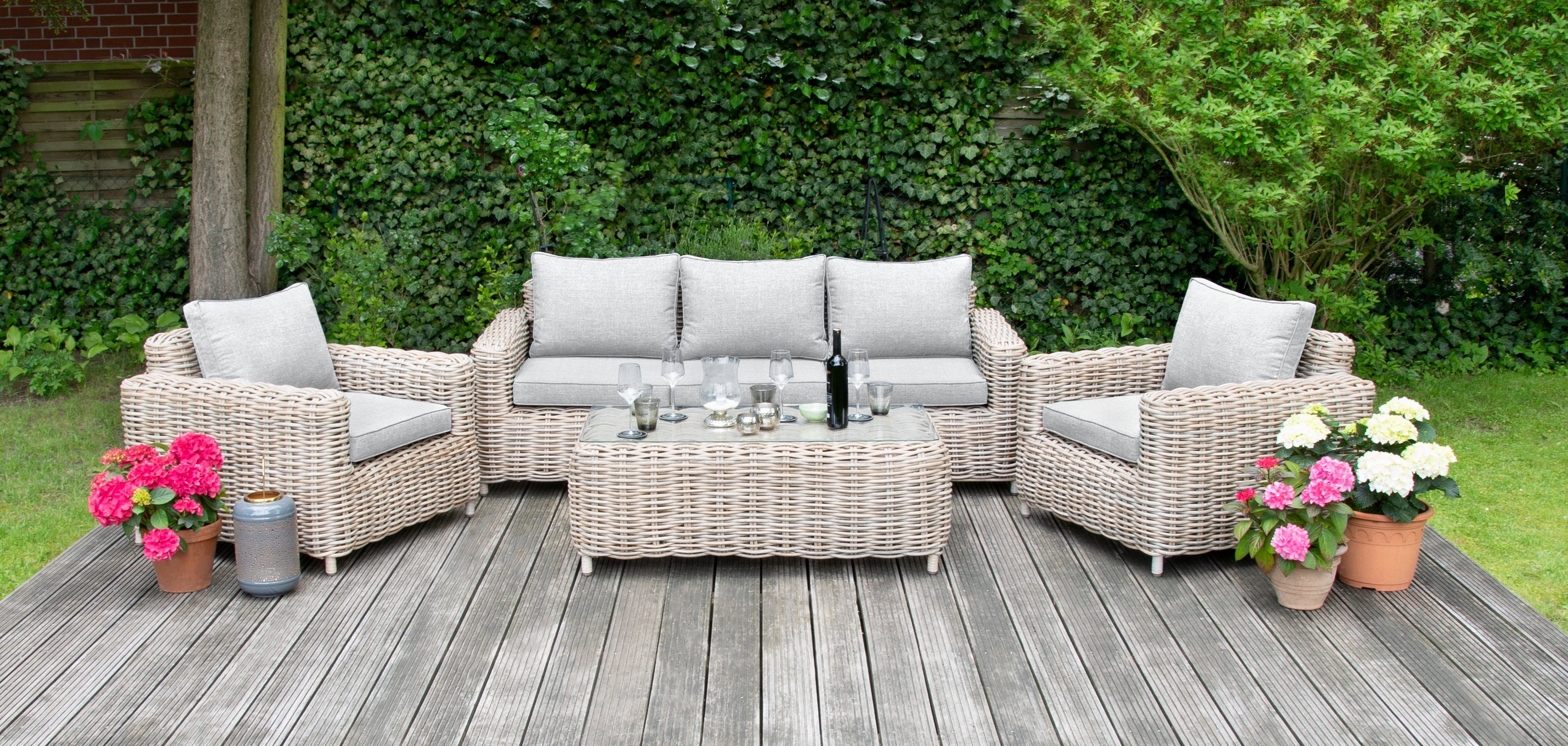 Dieses Verderoom Balkon Loungemöbel Set verwandelt deinen Balkon in eine richtige Wohlfühl-Oase! 6-teilig: 2 Mittelsofas, 1 Ecksofa, 2 Fußhocker und 1 Tisch - alles was du brauchst. Aus natürlichem Bambus mit Öl-Finish - super stabil und wetterbeständig. Mit bequemen Kissen in Taupe - 5 Sitzkissen und 6 Rückenkissen aus 100% Polyester. Sitzhöhe 30cm, Armlehnen 65cm hoch - perfekte Sitzposition zum Entspannen. Tisch: 55x65x30cm - ideal für Getränke oder Snacks. Dick gepolsterte Kissen für maximalen Komfort - stundenlang gemütlich sitzen. Flexibel arrangierbar - je nach Platz und Stimmung umstellbar. Perfekt für kleine Balkone oder Terrassen - platzsparend und stylisch. Einfache Montage mit beiliegender Anleitung - schnell aufgebaut. Ob für gemütliche Abende zu zweit oder kleine Gartenpartys - dieses Set macht immer eine gute Figur. Einfach hinsetzen, zurücklehnen und die Seele baumeln lassen - pure Entspannung!