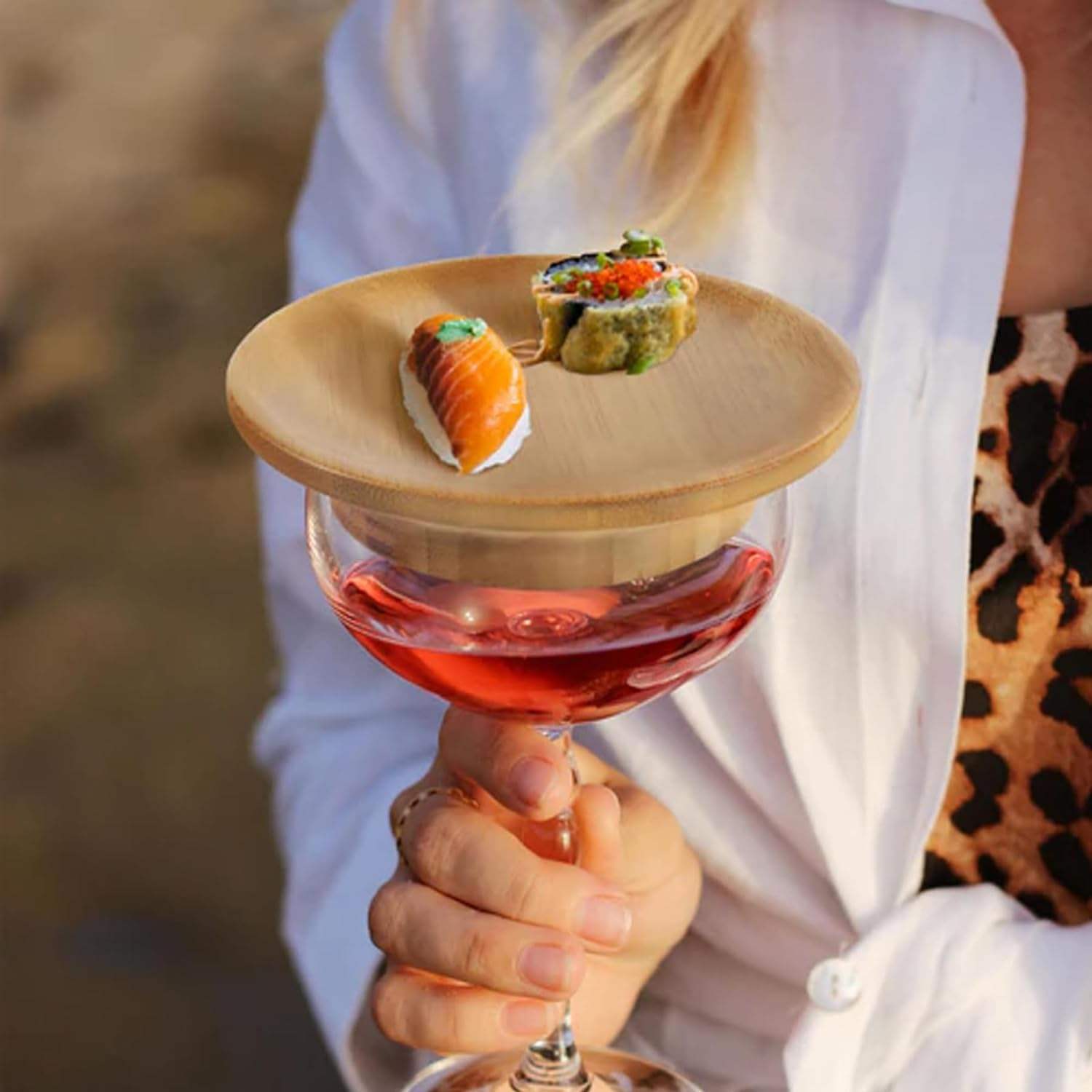 Hey, diese Weinglas-Topper sind genial für jede Party! Aus natürlichem Bambus, super stabil und nachhaltig. Im Set: 6 Topper und 12 Bambus-Stäbchen. Jeder Topper misst 10x10x2 cm - perfekte Größe für Weingläser. Du legst einfach den Topper auf dein Weinglas und schon hast du eine praktische Ablage für Snacks, Käse, Wurst oder Desserts. So kannst du Wein trinken und gleichzeitig snacken - ohne extra Teller! Verhindert Verschütten und Flecken auf der Kleidung. Einfach zu reinigen - mit warmem Seifenwasser abspülen. Perfekt für Weinproben, Partys, Abendessen oder gemütliche Abende. Sieht total stylisch aus und ist mega praktisch! Macht jedes Get-Together zu einem besonderen Event. Einfach aufsetzen, Snacks drauf und genießen!