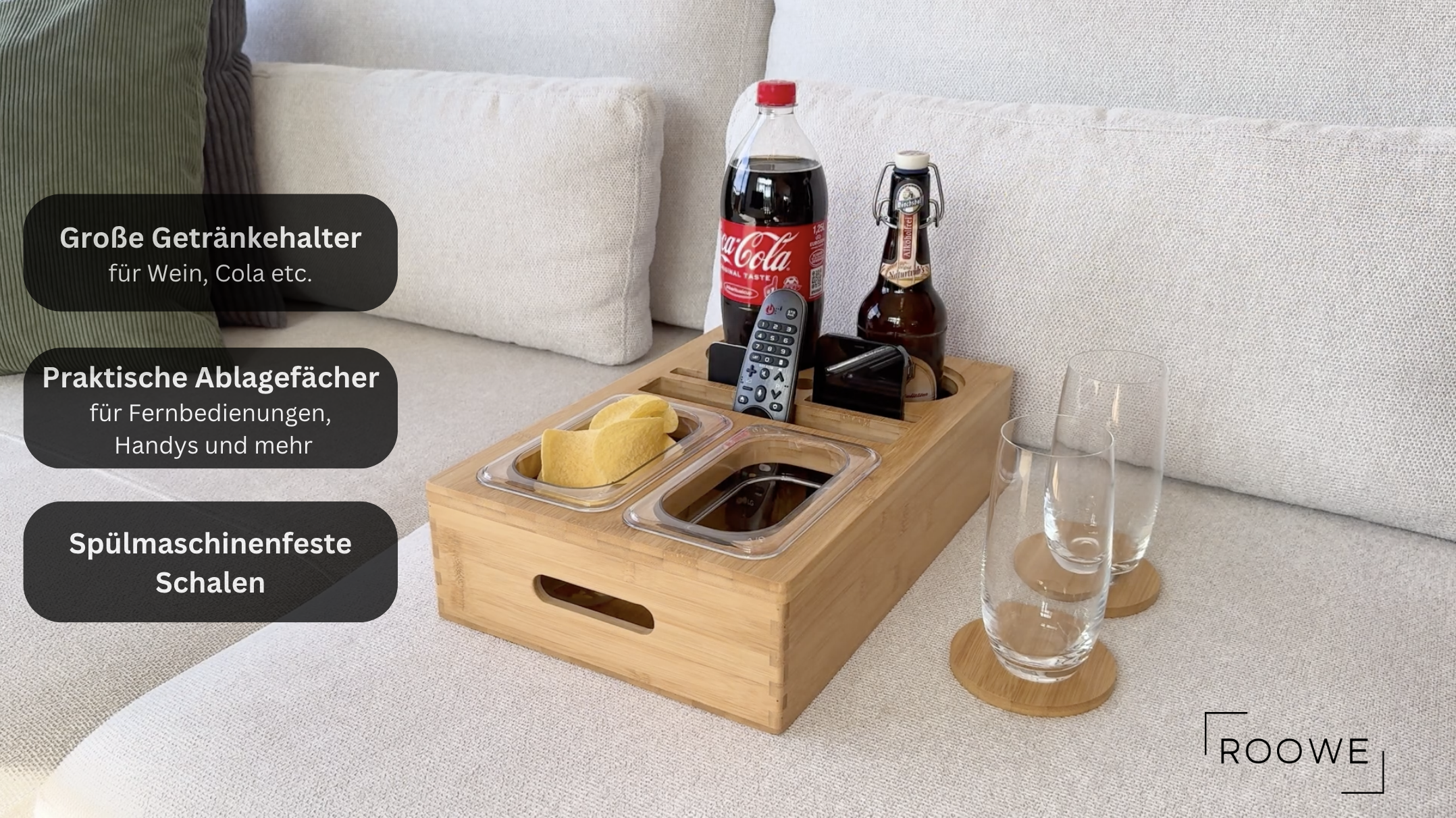 Kennst du das? Du liegst gemütlich auf der Couch, aber Fernbedienung, Snacks und Handy sind überall verstreut? Diese coole Couchbar von Yiomxhi bringt Ordnung ins Chaos! Aus hochwertigem Bambus, 25x25x8 cm groß - perfekt für die Couch, Bett oder Sessel.