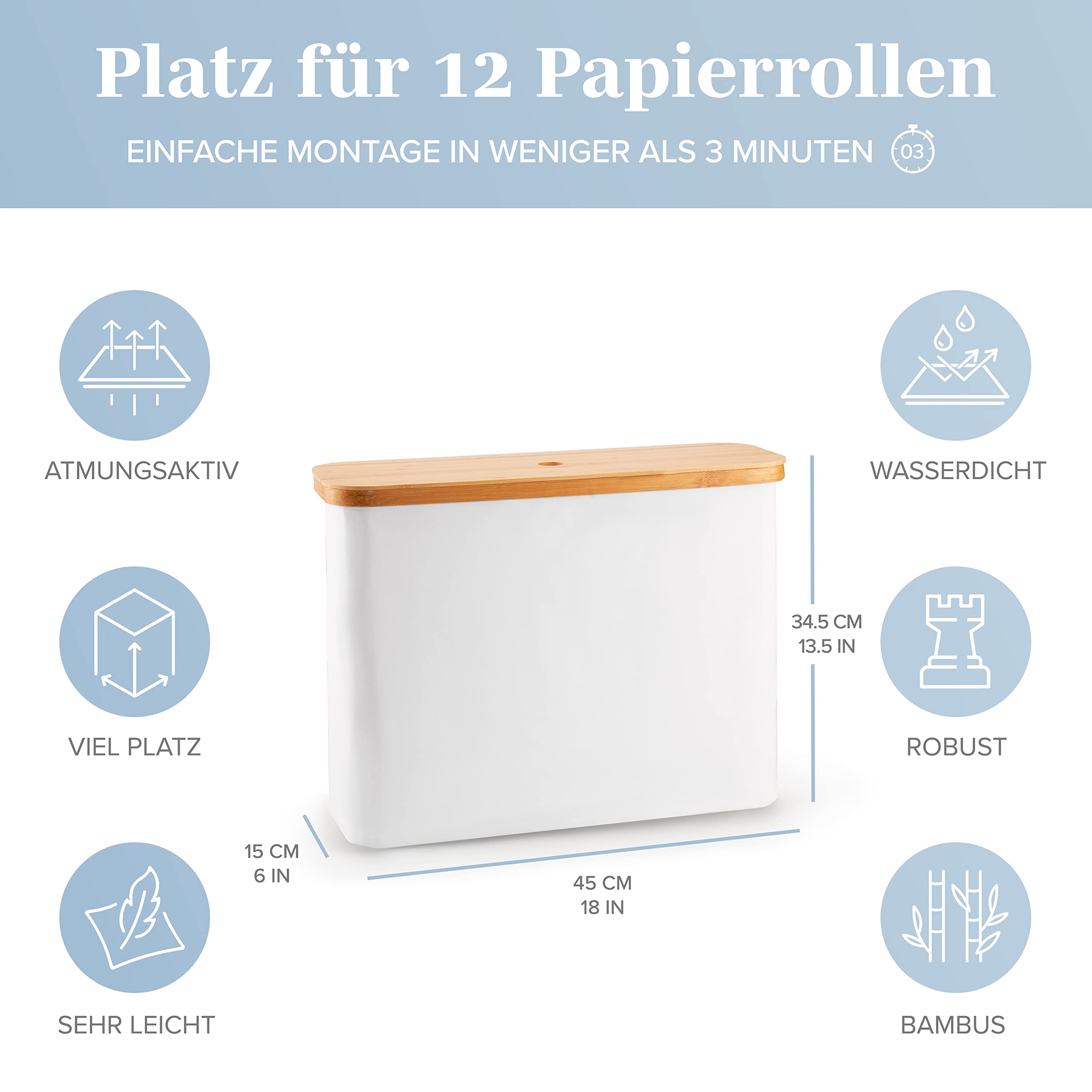 Endlich Ordnung im Bad! Dieser Bambus-Toilettenpapierhalter sieht nicht nur gut aus, sondern ist auch super praktisch. Aus antibakteriellem Bambus gefertigt - hygienisch und nachhaltig! Mit 45x15x35 cm passt er bis zu 12 Rollen rein - du bist also erstmal eingedeckt! Das coole Seitenfenster zeigt dir, wann es Zeit zum Nachkaufen ist. Der Deckel schützt vor Spritzwasser und Staub - alles bleibt sauber! Der rutschfeste Boden sorgt für Stabilität, und die Montage ist kinderleicht - kein Werkzeug nötig! Einfach zusammenstecken und schon kann's losgehen! Sieht total edel aus in Grau (auch in Schwarz oder Weiß erhältlich). Nicht nur für Toilettenpapier geeignet - auch für andere Badezimmer-Utensilien! Die atmungsaktiven Materialien verhindern unangenehme Gerüche - alles bleibt frisch! Perfekt für Gäste-WC oder das eigene Bad - macht einfach einen guten Eindruck! Einfach abwischen und schon ist er wieder blitzblank! So wird Aufräumen im Bad zum Vergnügen - versprochen!