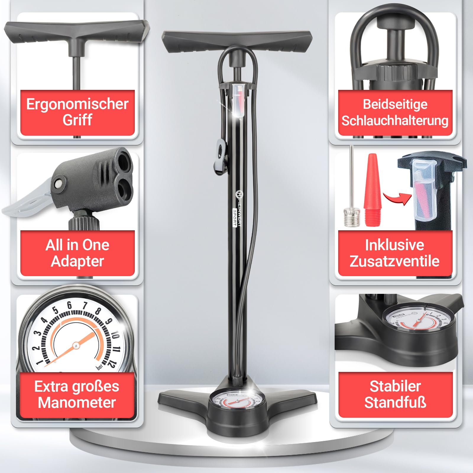 HEIMWERT Premium Fahrradpumpe 12 Bar - Universal Standpumpe Mit Manometer Für Alle Ventile