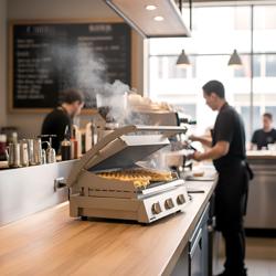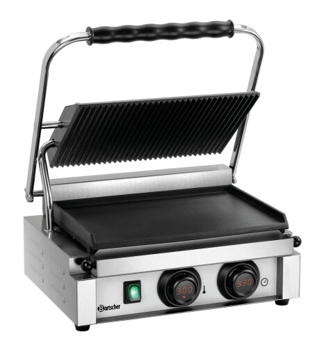 Dieser Bartscher Kontaktgrill ist ein echter Profi! 2,2kW Leistung - heizt schnell auf. Obere Platte gerillt, untere glatt - für perfekte Grillstreifen. Großzügige Grillfläche 335x220mm - für viele Sandwiches gleichzeitig. Temperatur von 50-300°C einstellbar - für alles geeignet. Mit Fettauffangschale und Reinigungsbürste. Ideal für Döner, Baguettes oder Fleisch. Aus robustem Chrom-Nickel-Stahl. 2 Jahre Garantie. Einfach ein Arbeitstier für Küche oder Imbiss!
