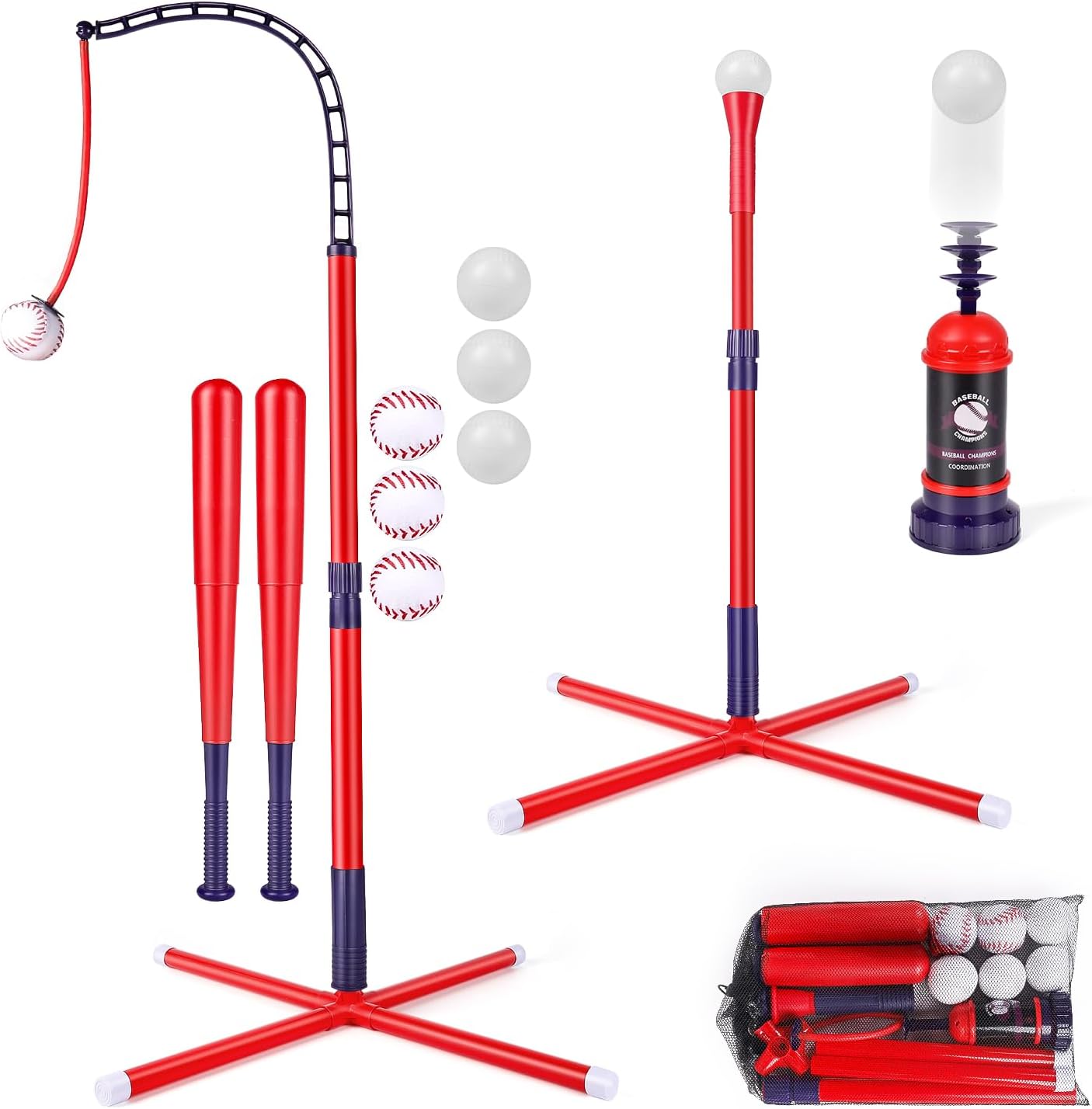 Batter up! Dieses 4-in-1 Baseball Set bringt den Ballspaß zu dir nach Hause. Mit hängendem Tee, Stand-Tee, Wurf-Fang-Spiel und automatischem Ballwerfer - hier ist für jeden was dabei! Die Höhe ist von 24-39 Zoll verstellbar, wächst also mit deinem Kind mit. Enthalten sind 2 Schläger, 2 Handschuhe und 6 weiche Bälle - alles sicher und BPA-frei. Die X-förmige Basis steht stabil, kippt nicht um. Perfekt für drinnen und draußen, ob im Garten oder Wohnzimmer (mit genug Platz!). Die Handschuhe haben verstellbare Riemen für die perfekte Passform. Mit praktischer Aufbewahrungstasche bleibt alles ordentlich. Super für Geburtstage, Weihnachten oder einfach so - ein Geschenk, das garantiert ankommt! In lila oder blau erhältlich. Ideal für Kinder von 3-5 Jahren, um Koordination und Sportbegeisterung zu fördern. Einfach aufbauen und losspielen!
