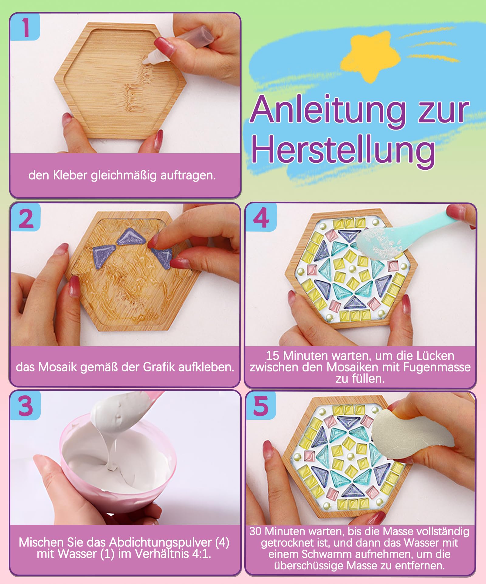 Total kreativ dieses Mosaik-Bastelset für Kinder! Enthält 4 Holzuntersetzer, Mosaiksteine, Fugenmasse, Farbe und alles was man braucht. Aus Glas und Holz, mit lebendigen Farben und glatten Oberflächen - sicher für Kinderhände. Fördert die Feinmotorik und Kreativität. Mit Video-Anleitung - auch für Anfänger geeignet. Perfekt für Mutter-Kind-Aktivitäten oder Kindergeburtstage. Ideal für Mädchen ab 5 Jahren. Die fertigen Untersetzer sind praktisch und dekorativ. Ein sinnvolles Geschenk, das lange Freude macht. Einfach auspacken und losbasteln!