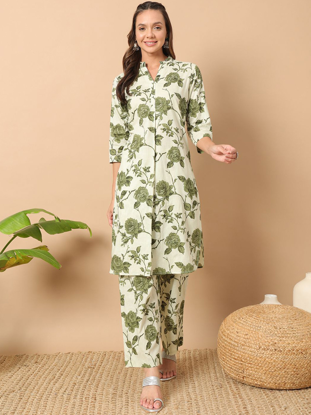 FIORRA Damen Kurta Baumwolle Hellgrün - Blumenmuster A-Linie Mit Langen Ärmeln