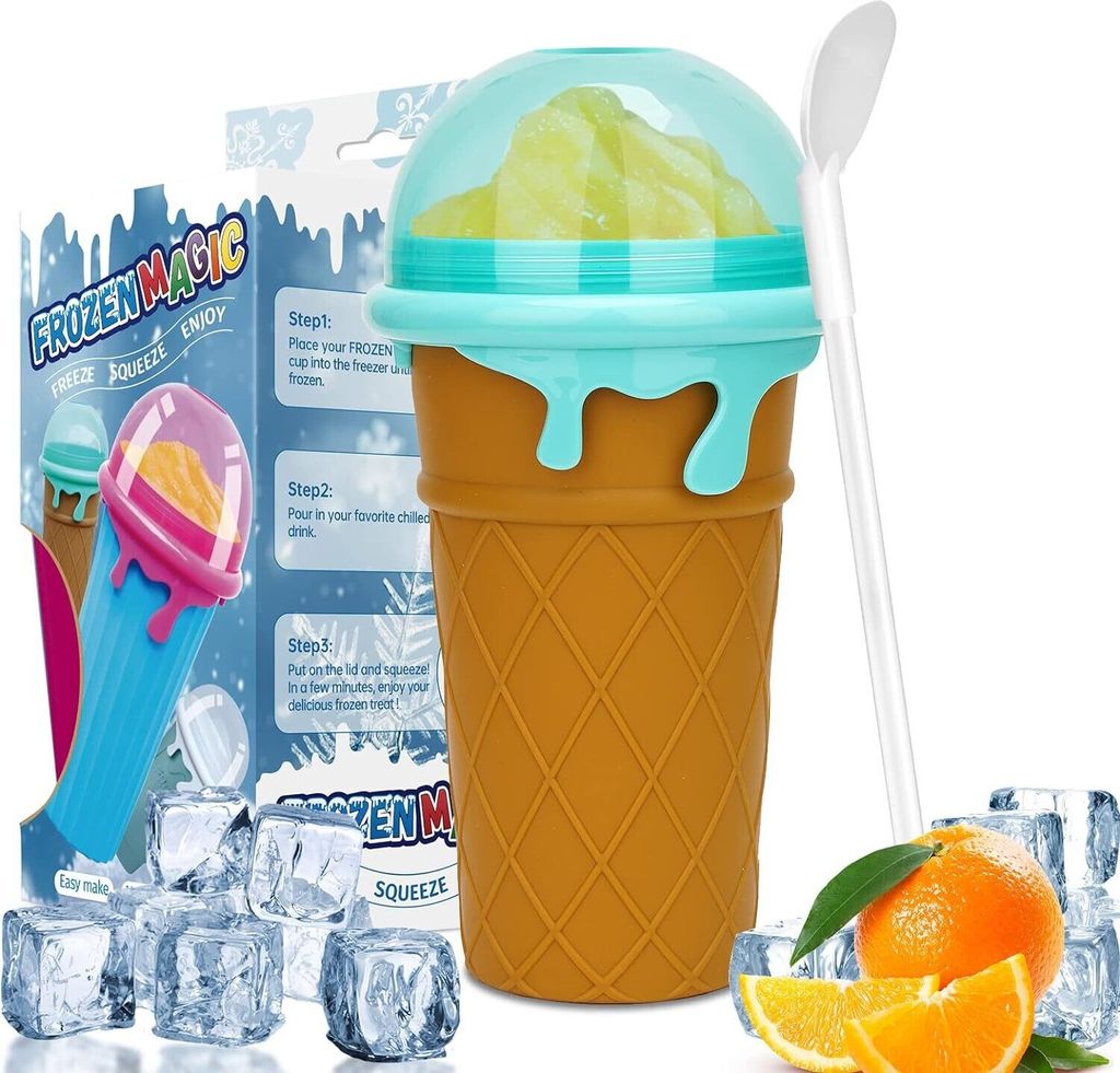Eisige Erfrischung selbst gemacht! Dieser Slush-Becher verwandelt deine Lieblingsgetränke in leckeres Slush-Eis - ganz ohne Strom! Einfach 4-6 Stunden einfrieren, Getränk einfüllen, kneten und in wenigen Minuten genießen. Aus BPA-freiem Silikon, mit 2-in-1 Löffel-Strohhalm. Perfekt für Cola, Saft, Milch oder Smoothies. Wiederverwendbar, auslaufsicher und ideal für Sommer, Garten, Camping oder Partys. Ein cooles Geschenk für Groß und Klein!