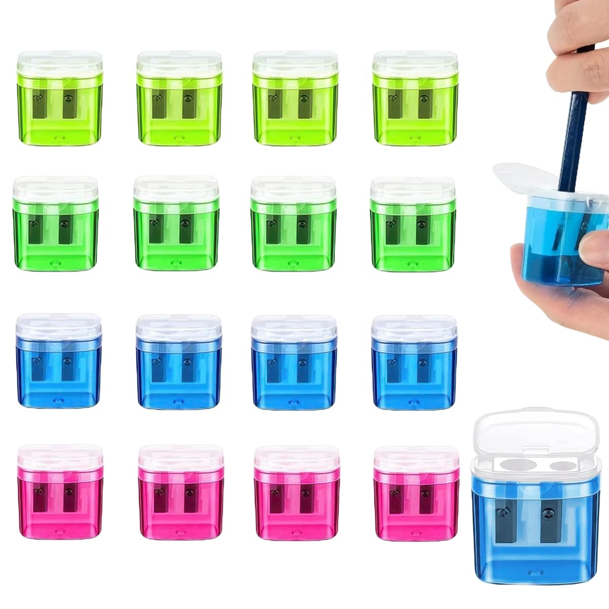 Total praktisch für Schule, Büro und Zuhause! Diese 8 Anspitzer im 4er-Farbmix (rot, grün, blau, gelb) haben beide Löcher für dicke und dünne Stifte. Der integrierte Behälter fängt alle Späne auf - kein Saubermachen mehr nötig!