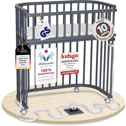 Wow, dieses babybay Beistellbett ist ja mal richtig durchdacht! Aus massivem Buchenholz und in schickem Schiefergrau lackiert - das sieht nicht nur gut aus, sondern hält auch ewig. Das geniale: Die Höhe ist stufenlos verstellbar! Du kannst es perfekt an dein Boxspringbett anpassen - ohne Spalt, ohne Stufe, einfach komplett nah bei deinem Baby. Und mit dem integrierten Verschlussgitter wird es im Handumdrehen zum sicheren Säuglingsbett für tagsüber. Noch sicherer wird's nachts mit dem verstellbaren Herausrollschutz. Aber das ist noch nicht alles! Mit den optionalen Rollen wird daraus ein vollwertiger Stubenwagen - praktisch für unterwegs. Oder du machst es zur kuscheligen Kinderbank mit höhenverstellbarer Sitzhöhe! Einfach unglaublich, wie vielseitig dieses Teil ist. Die spezielle Gurtbefestigung macht die Montage am Elternbett super einfach. Und babybay ist mehrfach ausgezeichnet - sogar Hebammen und Stillberater empfehlen es als ideales Stillbett. Egal ob als Beistellbett, Babybett, Stubenwagen oder später als Sitzbank - dieses Ding wächst einfach mit! Umweltfreundlich hergestellt und richtig langlebig. Einfach ein Must-Have für junge Eltern, die Wert auf Nähe und Sicherheit legen. Damit schläft dein Baby geborgen und du hast es immer in Reichweite!