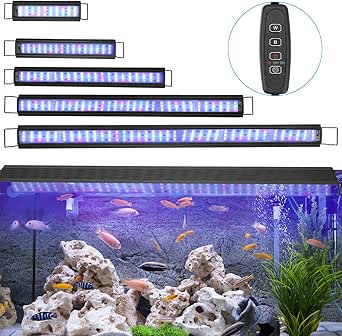 Bring dein Aquarium zum Strahlen mit dieser professionellen LED-Beleuchtung von Peviasot! Die 36W Leuchte für 87-110cm Becken bietet alles, was deine Fische und Pflanzen brauchen. Mit automatischem Timer für 6, 10 oder 12 Stunden Betrieb - nie wieder manuelles An- und Ausschalten! Vier Beleuchtungsmodi: Weißlicht für optimales Pflanzenwachstum, Blaulicht für gesunde Korallen, Rotlicht für Fischgesundheit und Grünlicht zur Stressreduktion. Die ausziehbare Halterung passt sich perfekt deinem Aquarium an, das Aluminium-Gehäuse ist feuchtigkeitsbeständig und wärmeleitend. Perfekt für Süß- und Salzwasseraquarien mit anspruchsvollen Pflanzen. Die SMD-LEDs sind energieeffizient, umweltfreundlich und haben eine lange Lebensdauer. Einfache Installation - einfach aufsetzen und den Timer programmieren. Deine Unterwasserwelt wird in den schönsten Farben erstrahlen! Inklusive Netzteil und Bedienungsanleitung. Für alle, die ihr Aquarium professionell beleuchten wollen, ohne viel Aufwand. Deine Fische und Pflanzen werden es dir danken!
