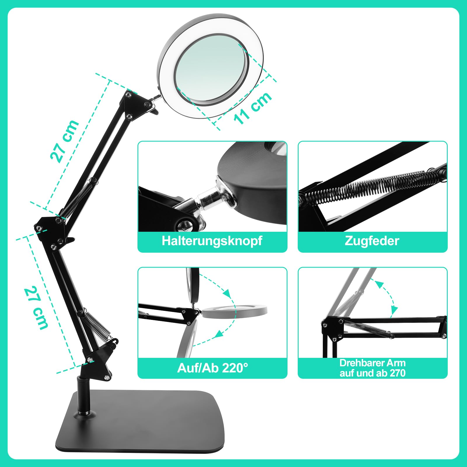 Diese LED-Lupe ist der absolute Alleskönner für alle Bastler und Hobby-Handwerker! Mit 10-facher Vergrößerung durch hochwertiges optisches Glas siehst du selbst die kleinsten Details ganz genau. Die Beleuchtung bietet 3 Farbmodi - kaltes, natürliches und warmes Licht - und ist in 10 Helligkeitsstufen dimmbar. Der flexible Schwenkarm lässt sich in jede Position bringen und der Lampenkopf dreht sich 360 Grad. Praktisch: Sie kommt sowohl mit stabilem Metallsockel als auch mit Tischklemme für die Befestigung an der Tischkante. Perfekt für Modellbau, Näharbeiten, Elektronik-Reparaturen oder einfach zum entspannten Lesen. So macht Arbeiten mit kleinen Teilen richtig Spaß!