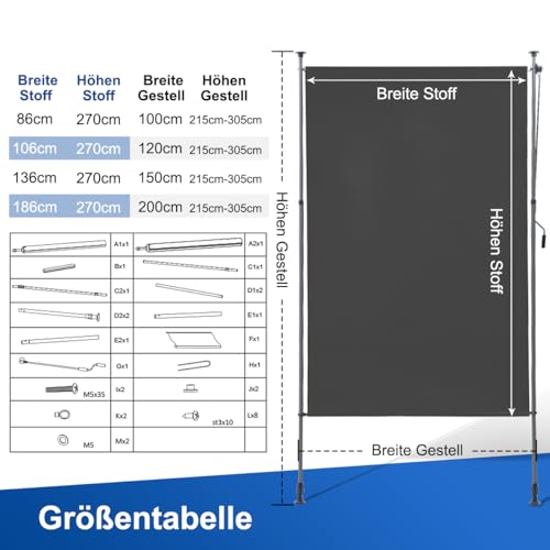 Wow, mit dieser Senkrechtmarkise machst du deinen Balkon zur Wohlfühloase! Komplett ohne Bohren montierbar - die zwei Stehpfosten sind von 2,1 bis 3m höhenverstellbar! In Dunkelgrau mit 150cm Breite und 270cm Auszug - bietet perfekten Sicht- und Sonnenschutz! Aus robustem Polyester mit 180g/m² und wasserabweisender PU-Beschichtung - hält auch mal einem Regenschauer stand! Mit praktischer Handkurbel lässt sich die Markise ganz easy bedienen - einfach drehen und die gewünschte Länge einstellen! Der Markisenkasten aus 100% Aluminium ist korrosionsbeständig - hält viele Jahre! Schützt nicht nur vor neugierigen Blicken, sondern auch vor Wind und zu starker Sonne! Perfekt für Balkon, Terrasse oder Wintergarten! Das komplette Zubehör ist im Lieferumfang enthalten - inklusive Anleitung! Einfach aufstellen und sofort mehr Privatsphäre genießen! Für alle, die ihren Außenbereich gemütlicher machen wollen - ohne großen Montageaufwand!