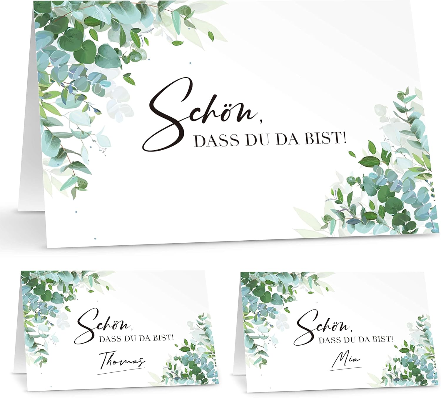 Perfekte Tischkarten für deine Feier! Im Set mit 50 Stück - genug für alle Gäste. Jede Karte hat auf der Rückseite den netten Spruch 'Schön, dass Du da bist' und auf der Vorderseite viel Platz zum Selbstbeschriften. Ob Namen für Sitzplatz-Zuweisung oder Speisen-Beschriftung fürs Buffet - total flexibel einsetzbar. Aus stabilem 300g Papier, gefaltet auf 85x55mm - stehen sicher auf jedem Tisch. Verschiedene Designs verfügbar: von Blumen über Eukalyptus bis zu modernen Motiven. Perfekt für Hochzeiten, Geburtstage, Taufen oder Firmenfeiern. Mach deine Feier persönlich und organisiert!