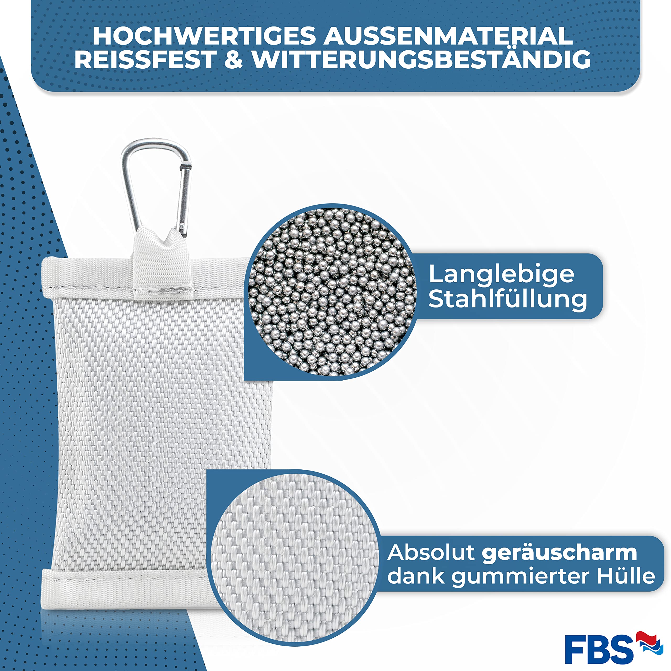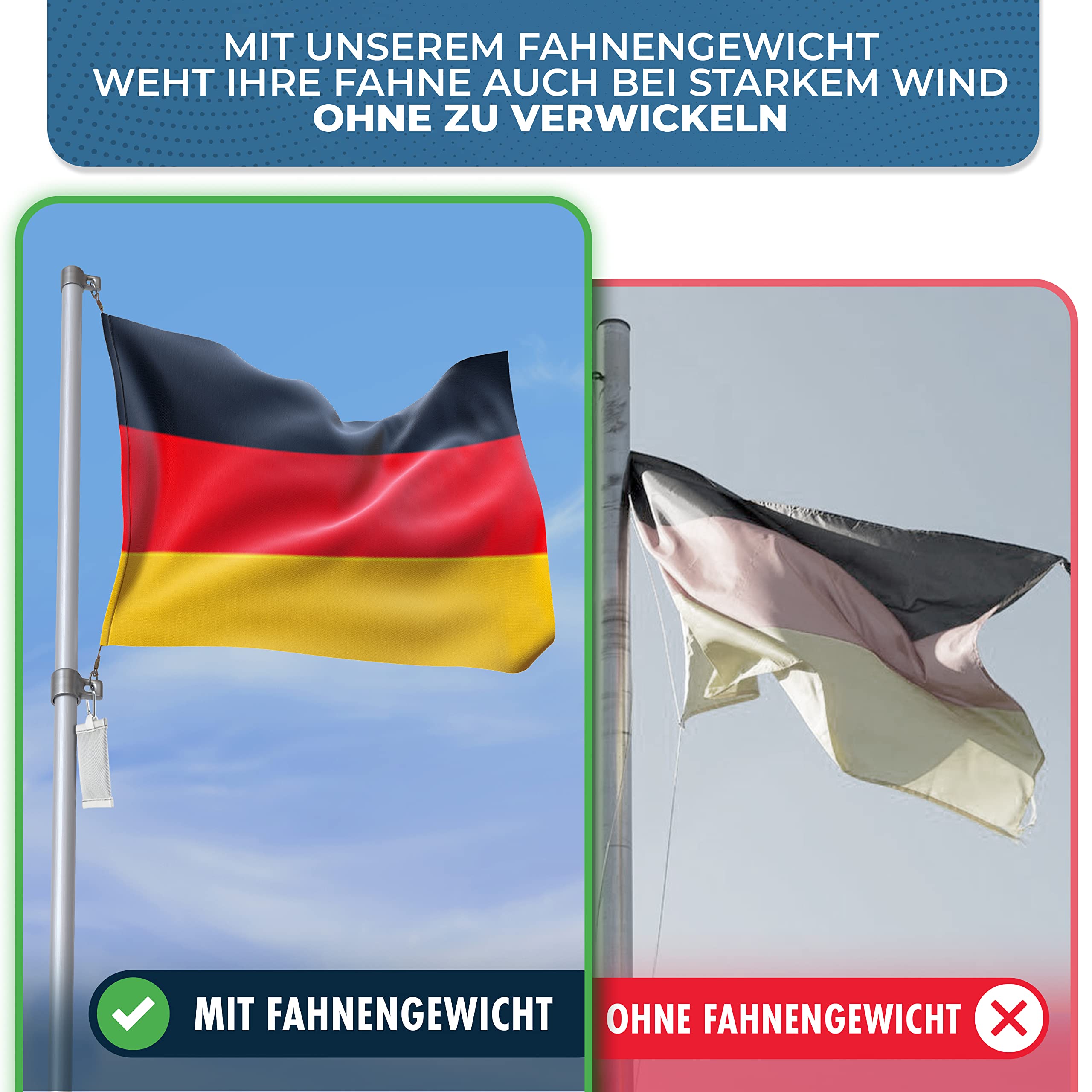 Praktisch! Damit weht deine Fahne auch bei starkem Wind stolz im Wind! 🚩\n\nDieses Fahnengewicht im Detail:\n• Gewicht: 450g\n• Maße: 14cm lang, 9cm breit\n• Farbe: Grau\n• Material: Glasfaser + Superschutztuch\n\nIm Lieferumfang:\n• 1x Beschwerungssäckchen\n• 1x Karabinerhaken mit Drehgelenk\n• 1x Karabiner\n\nWas es so besonders macht:\n• Sonnen- und wasserfest\n• 360° drehbares Design\n• Einfache Handhabung\n• Verhindert Verdrehen der Fahne\n• Für innen und außen\n\nEinfach am Fahnenmast befestigen und schon bleibt deine Fahne auch bei Sturm schön gestreckt. Das rotierende Design verhindert, dass sich die Fahne um den Mast wickelt.\n\nSuper für:\n• Garten-Fahnen\n• Veranstaltungen\n• Filmsets\n• Fotosessions\n• Werbefahnen\n\nDas Material ist absolut wetterbeständig und hält auch bei Regen und starker Sonne problemlos durch. Deine Fahne sieht immer perfekt aus!\n\nEinfach anklicken, befestigen, fertig! Deine Fahne wird es dir danken! 👍