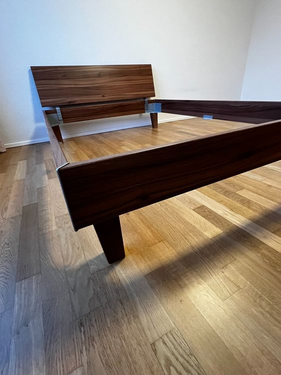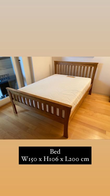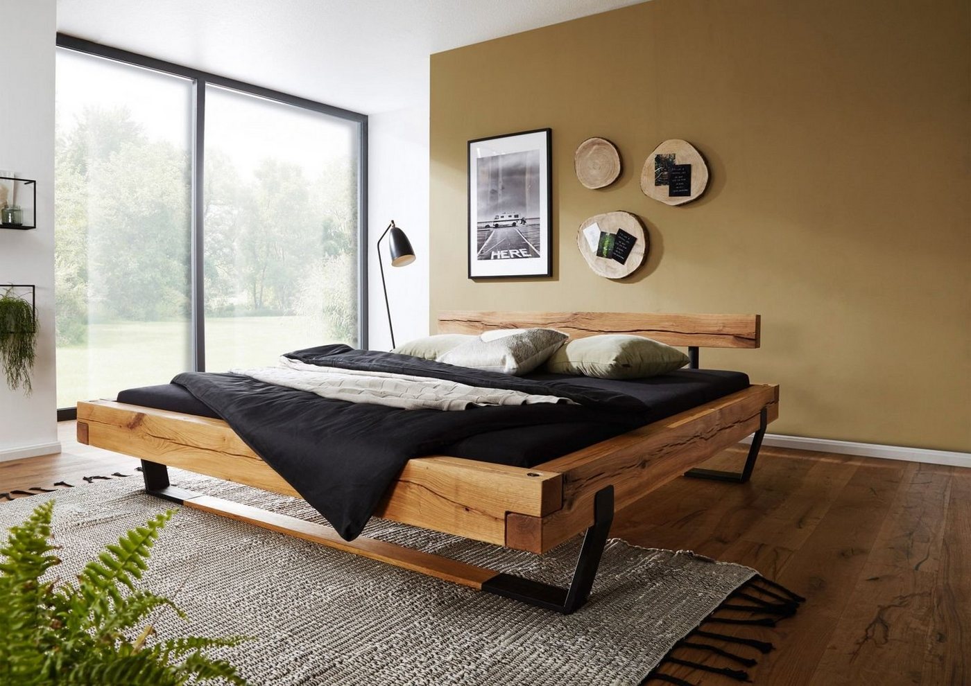 Skandinavisches Design meets moderne Eleganz! Dieses wunderschöne Bettgestell aus massiver Eiche kombiniert natürliche Wärme mit industriellem Flair. Maße 144,5x215x77,7cm, Liegefläche 140x200cm. Die schwarzen Metallkufen sorgen für stabilen Stand und kontrastieren perfekt mit dem geölten Eichenholz. Mit massivem Kopfteil zum gemütlichen Anlehnen. Einfach aufzubauen - auch für Heimwerker-Anfänger geeignet. Ohne Lattenrost und Matratze. Schafft eine gemütliche Atmosphäre in deinem Schlafzimmer - für erholsame Nächte!
