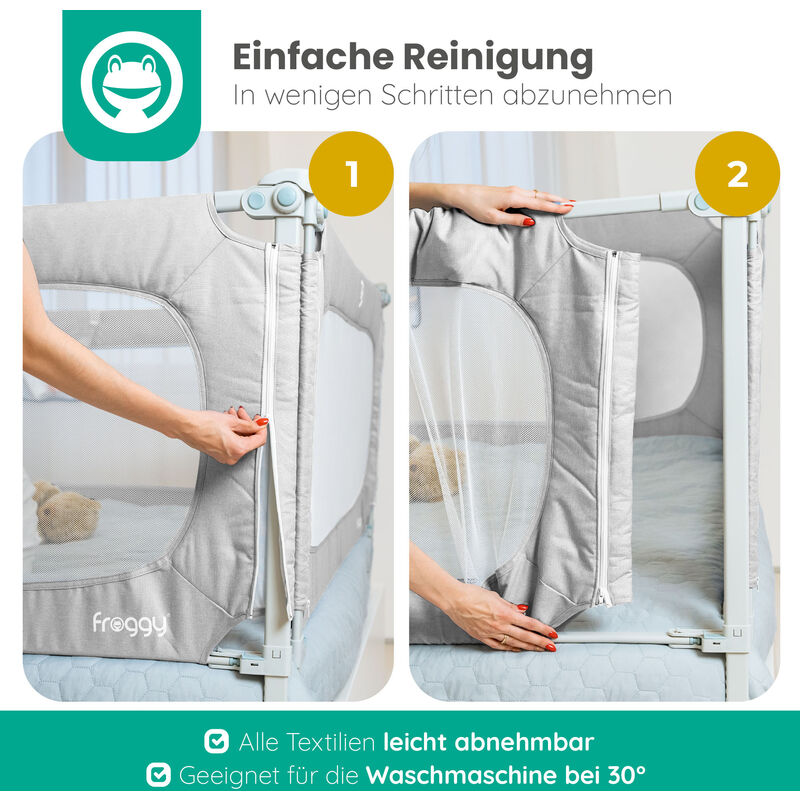 Das Kidsgigglz Bettgitter gibt dir die Sicherheit, dass dein Kleines nachts nicht aus dem Bett fällt - und dir damit ruhigere Nächte! Mit 180 cm Länge passt es an die meisten Kinderbetten und Boxspringbetten. Die Höhe ist stufenlos von 70-93 cm verstellbar - ideal für verschiedene Matratzenstärken. Das atmungsaktive Netzgewebe ermöglicht dir, dein Kind immer im Blick zu haben. Die Hubstange lässt sich ganz einfach nach unten klappen, wenn du zum Kind willst. Ohne Werkzeug montiert - einfach zusammenstecken und fertig! Der weiche Überzug an der oberen Stange schützt vor Stößen. Mit Y-förmigem Verstärkungsgurt für extra Stabilität. So kann dein Kind sicher die Welt des großen Bettes entdecken!