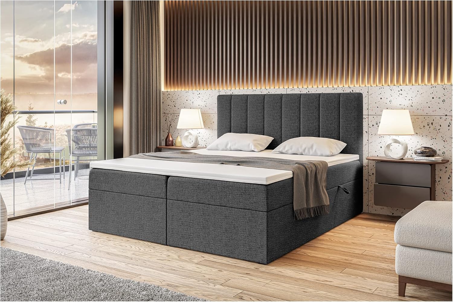 Schlaf wie royalty mit diesem wunderschönen Boxspringbett von MEBLINI! Das Dani Gold Modell in elegantem Dunkelgrau Samt bringt Luxus in dein Schlafzimmer. Mit den Maßen 200x220 cm bietet es reichlich Platz und mit der mittelfesten H3 Matratze optimalen Liegekomfort. Das handgesteppte Kopfteil ist ganze 115 cm hoch und sorgt für gemütliches Sitzen im Bett. Besonders praktisch: Die zwei großen Bettkästen mit Federmechanismus bieten jede Menge Stauraum für Bettwäsche, Kleidung oder andere Dinge. Der hochwertige Matt Velvet Stoff ist nicht nur super weich, sondern auch wasserabweisend, flammhemmend und mit 100.000 Martindale-Zyklen extrem scheuerfest. Im Lieferumfang ist alles enthalten was du brauchst: Bettgestell mit Stauraum, Kopfteil, 7-Zonen-Taschenfederkernmatratze und einen 4 cm hohen Topper für extra Komfort. Die Metallfüße sind 4,5 cm hoch und geben dem Bett einen eleganten Schwebezustand. Ein Traumbett das Komfort, Stauraum und stylisches Design perfekt vereint!