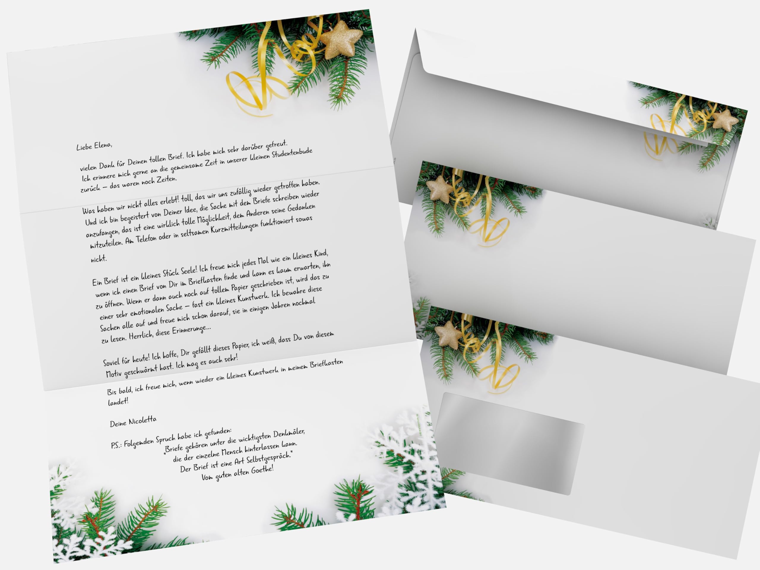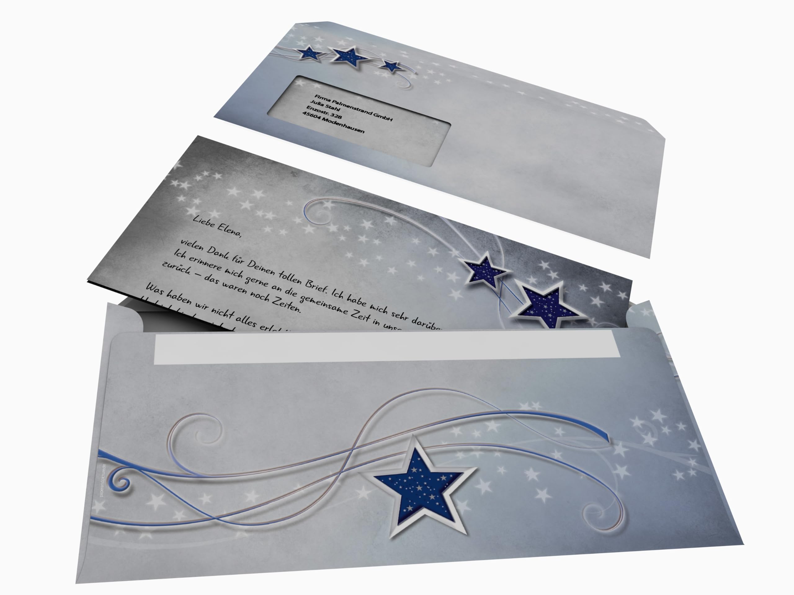 Hey, für die ganz persönlichen Weihnachtsgrüße ist dieses Briefpapier-Set einfach perfekt! Du kriegst 20 Blatt hochwertiges Motivpapier im DIN A4 Format mit dem hübschen \Simply Stars\ Design und dazu 20 passende Umschläge im DIN Lang Format (220x110 mm) - und das alles ohne lästiges Fenster! Das Papier ist einseitig bedruckt und lässt sich super mit dem Tinten- oder Laserdrucker bearbeiten, oder du beschreibst es einfach von Hand für diesen ganz persönlichen Touch. Die Umschläge haben praktische Haftklebestreifen und können mit normalem Briefporto verschickt werden. Als Extra gibt's noch eine kostenlose Broschüre mit tollen Tipps, Textbausteinen und kreativen Ideen für deine Weihnachtsbriefe - einfach downloaden und inspirieren lassen! So machst du deine Weihnachtspost zu etwas ganz Besonderem, ohne stundenlang rumexperimentieren zu müssen. Egal ob für Familie, Freunde oder Geschäftspartner - mit diesem Set hinterlässt du einen bleibenden Eindruck!