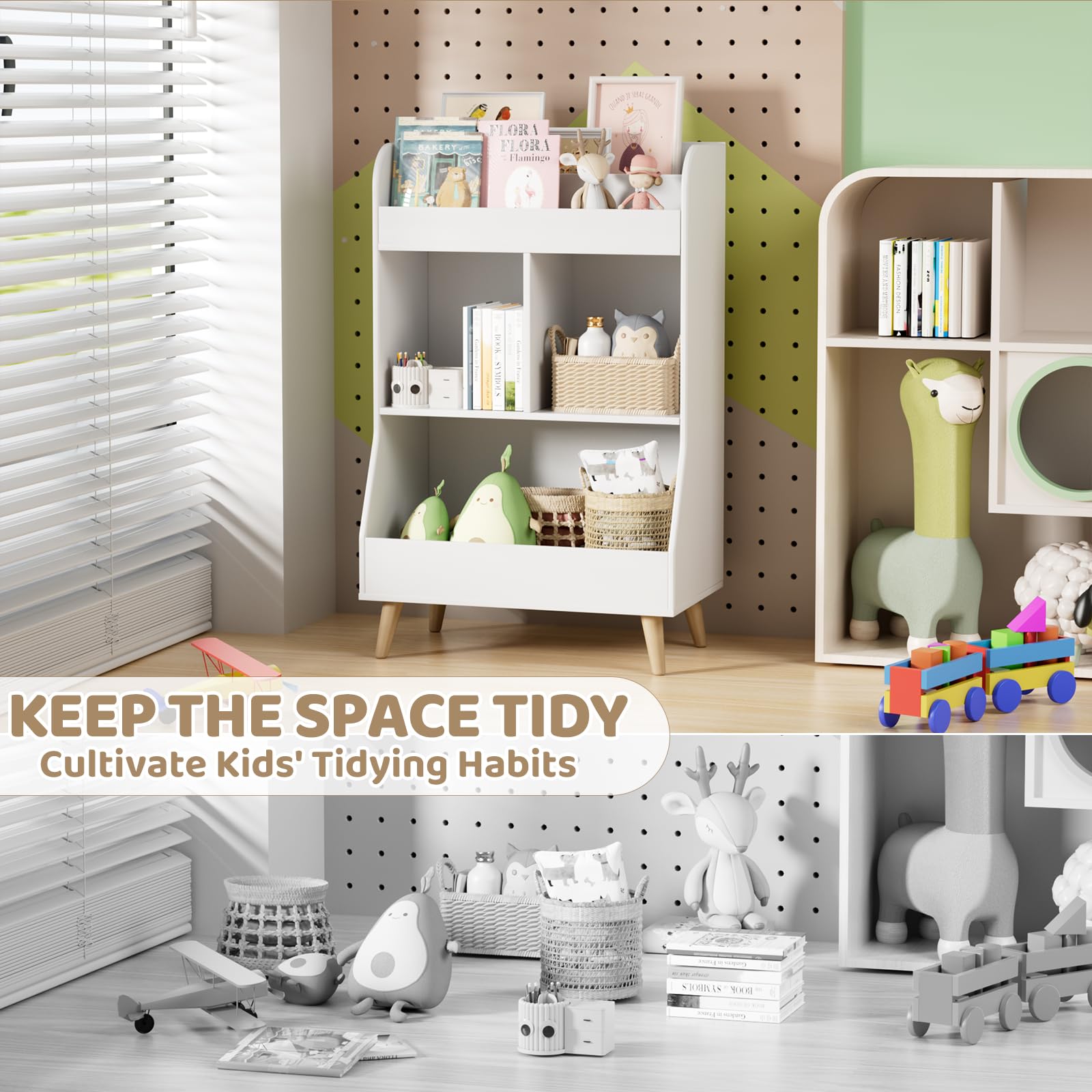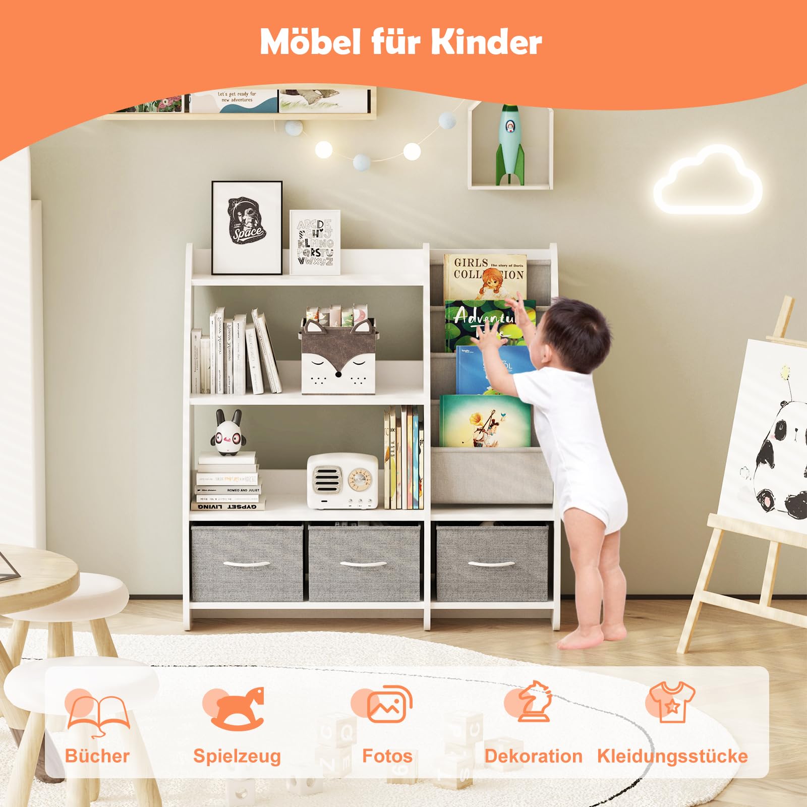 Perfektes Regal fürs Kinderzimmer! Dieses MAMIZO Kinderregal in blau (94x62x34cm) bringt Ordnung in Bücher und Spielzeug. Mit 2 Ablagefächern und 3 offenen Fächern ist für alles Platz. Oben passen Bilderbücher perfekt rein, in der Mitte Spielzeug und Schreibwaren, unten größere Puppen. Aus stabilem MDF und Kiefernholz - hält bis zu 50kg aus! Die Beine sind aus robustem Gummibaumholz und die Ecken sind abgerundet für maximale Sicherheit. Mit Wandbefestigung gegen Umkippen. Nur 13kg leicht und einfach zu montieren. Perfekt für Kinder von 2-10 Jahren. Sieht nicht nur gut aus, sondern ist auch super praktisch!