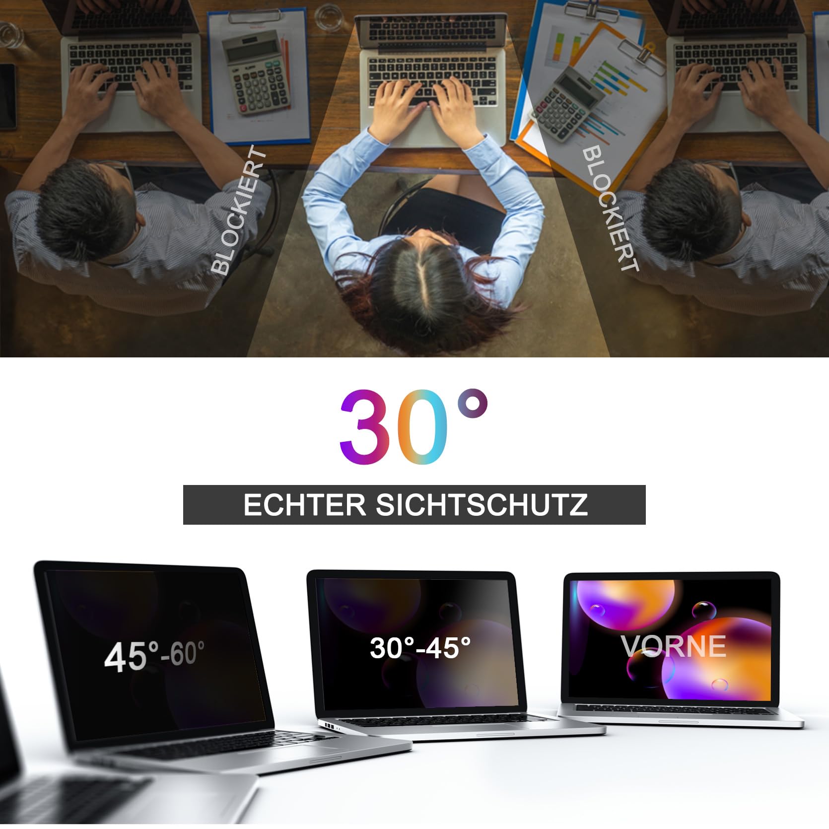 Schluss mit neugierigen Blicken im Zug oder Café! Diese Blickschutzfolie für deinen 14-Zoll-Laptop sorgt dafür, dass nur du siehst, was auf deinem Bildschirm passiert. Sobald jemand seitlich guckt, wird der Bildschirm dunkel - ab etwa 30 Grad Blickwinkel. Perfekt also für unterwegs oder im Großraumbüro! Die Folie hat zwei Seiten: eine matte gegen Reflexionen und eine glänzende für maximale Helligkeit. Du kannst wählen, was dir besser gefällt! Ein weiterer großer Vorteil: Der integrierte Blaulichtfilter schont deine Augen bei langem Arbeiten. Zwei Montage-Optionen stehen zur Verfügung - entweder mit festklebendem Band oder mit abnehmbaren Clips für flexiblen Wechsel. Passt auf die meisten 14-Zoll-Modelle mit 16:9 Format (310x174mm): Dell Inspiron, ASUS ZenBook, HP Pavilion, Lenovo ThinkPad und viele mehr. Einfach anbringen und schon bist du vor neugierigen Blicken sicher. Deine Daten gehören dir - behalte die Kontrolle über deine Privatsphäre!